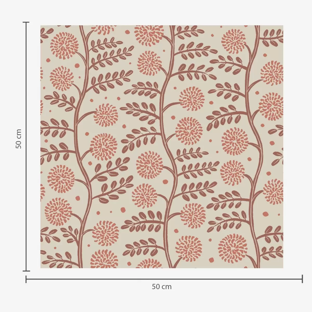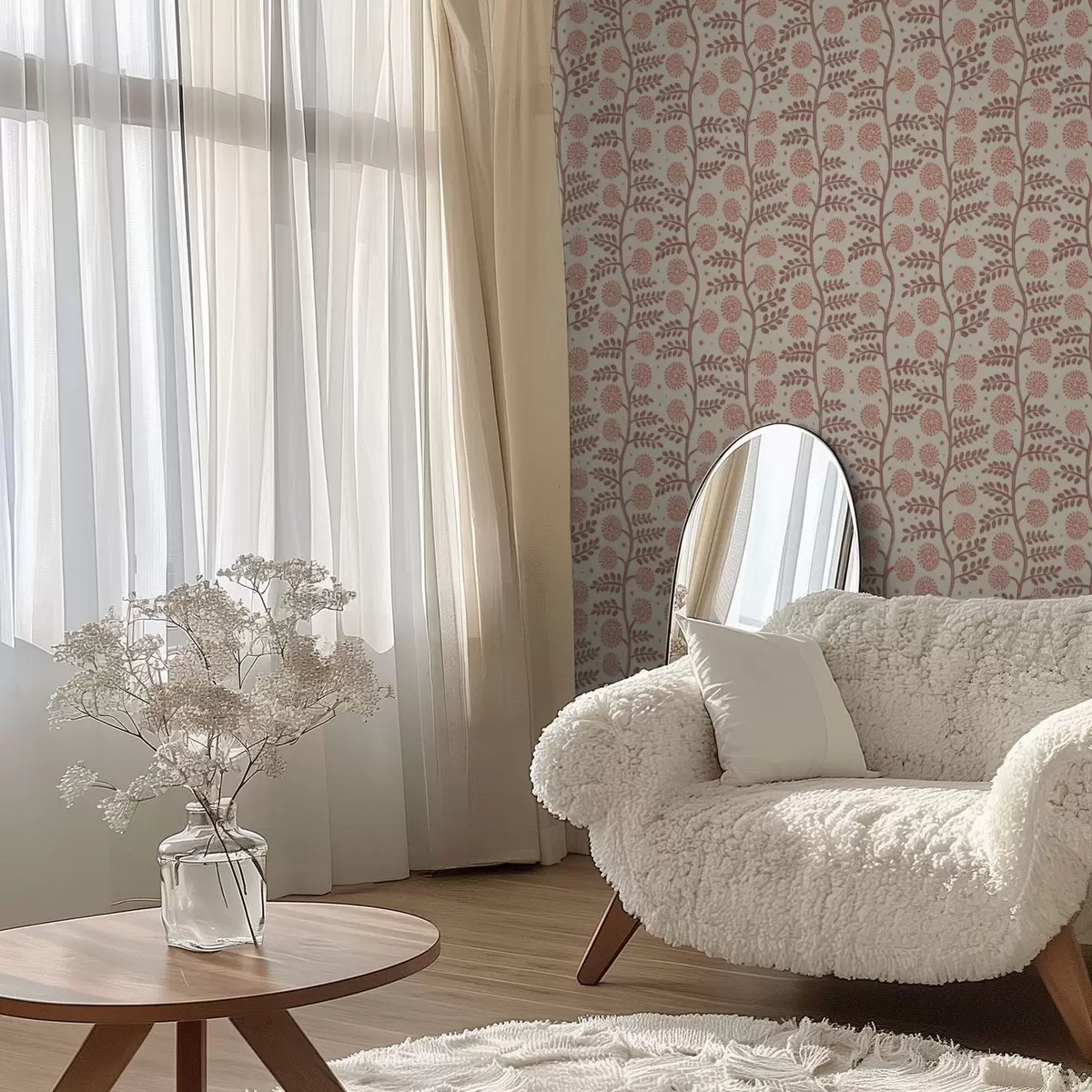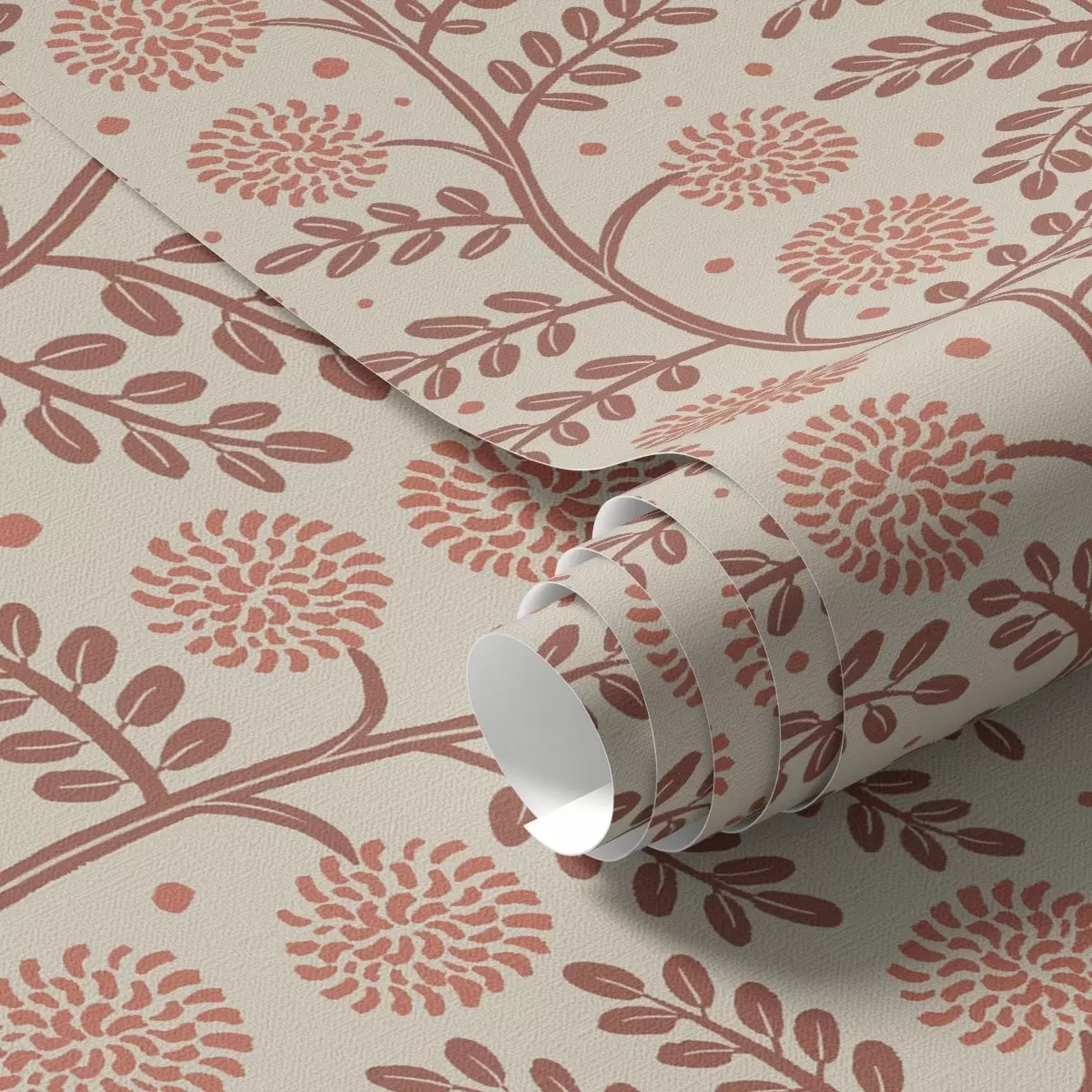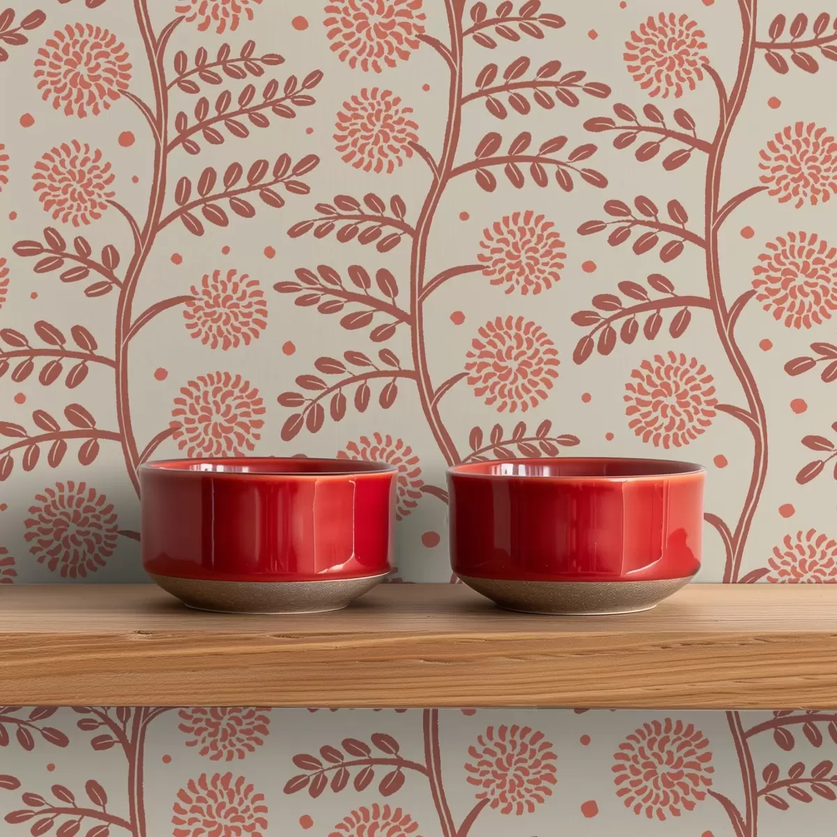 Tapete Terrakottafarbene Stiele mit korallenroten, flauschigen Blüten auf cremefarbenem Hintergrund Nr. a00997v1