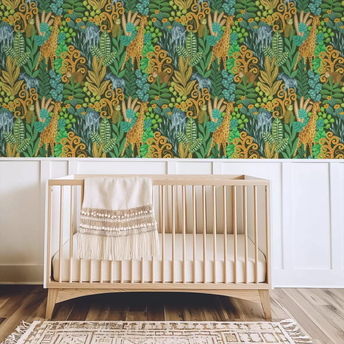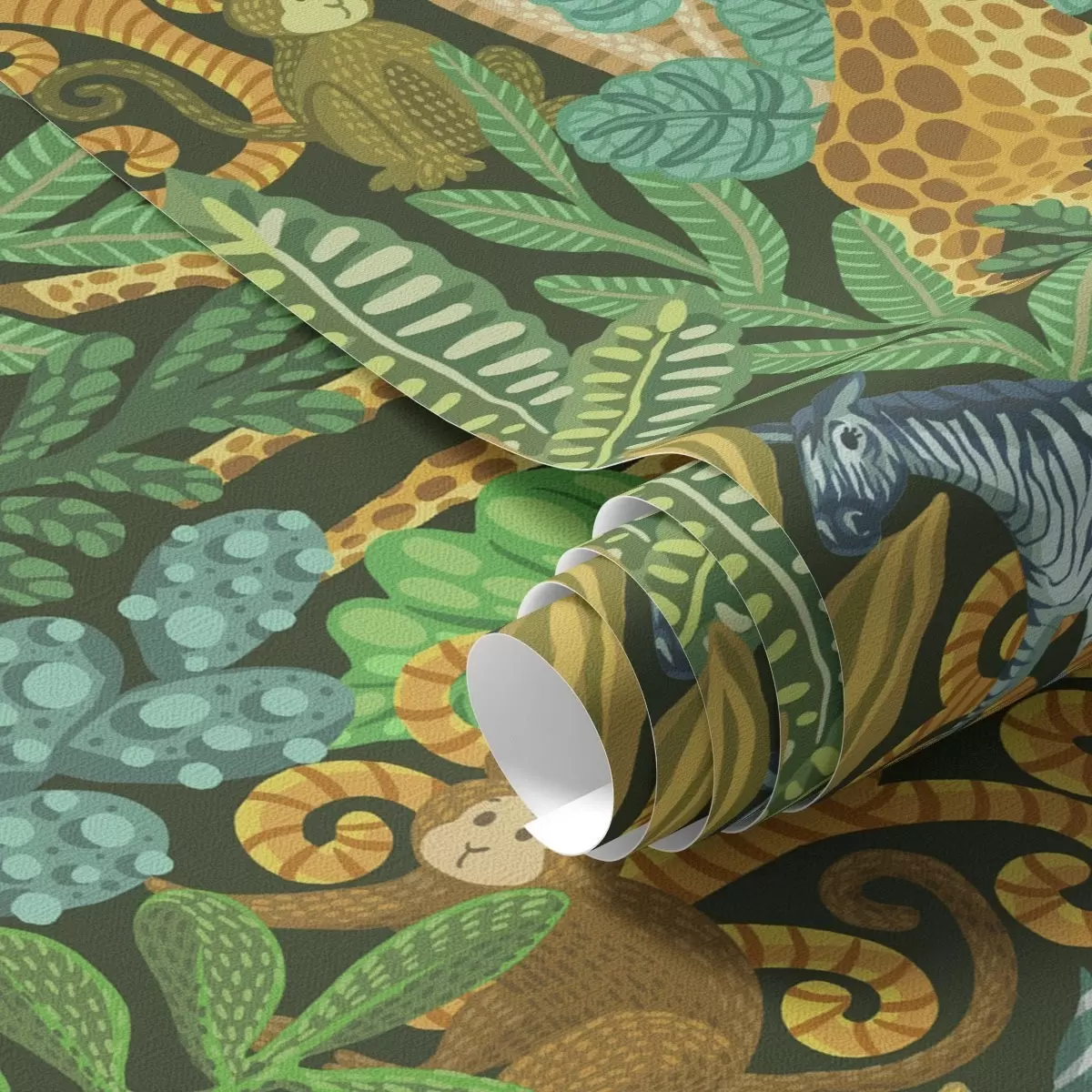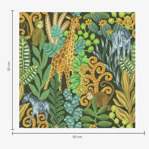 Tapete Dichter Dschungel mit Tieren auf dunkelgrünem Hintergrund Nr. a01000v2