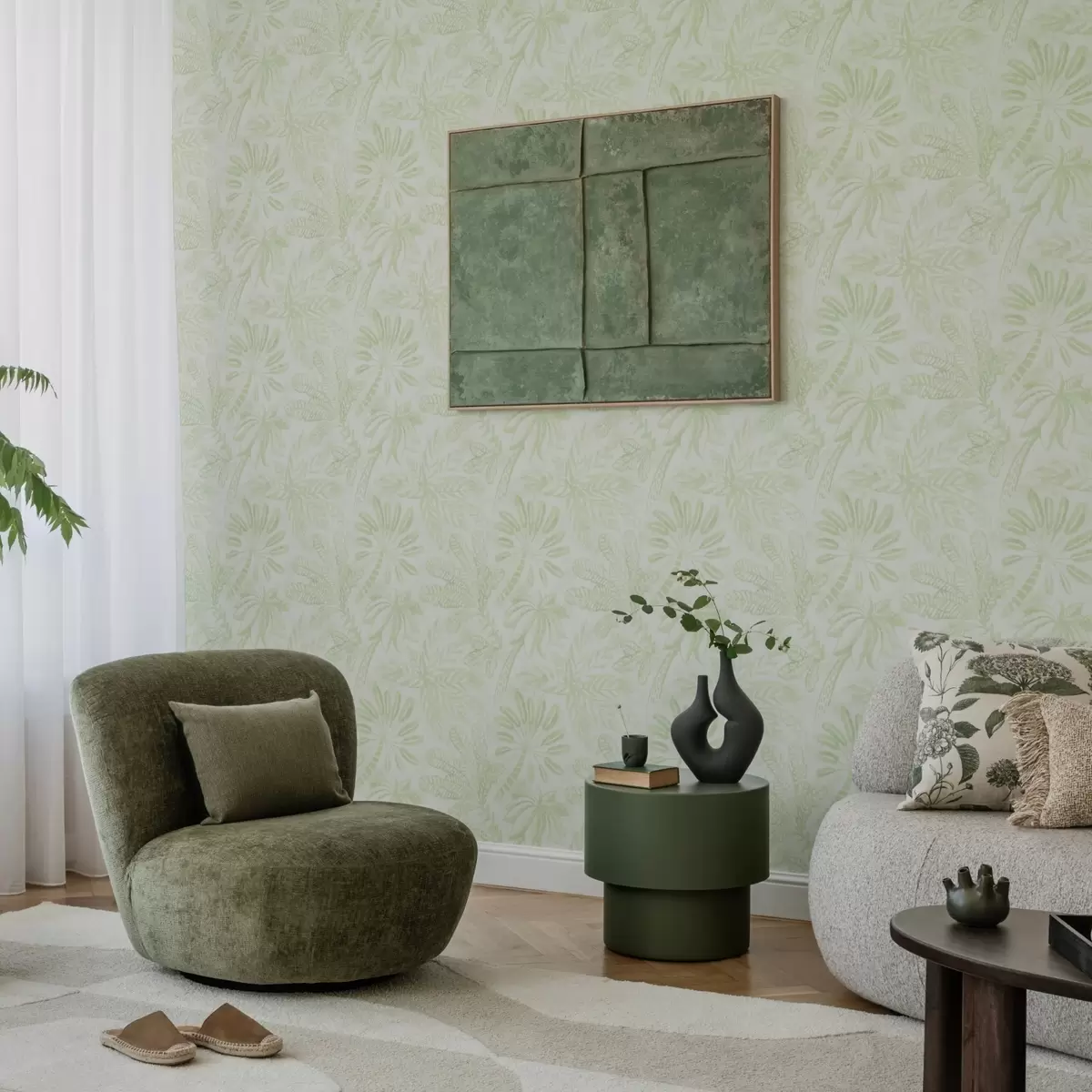 Tapete Skizzierte tropische Blätter in frischen Hellgrüntönen Nr. a01001v1