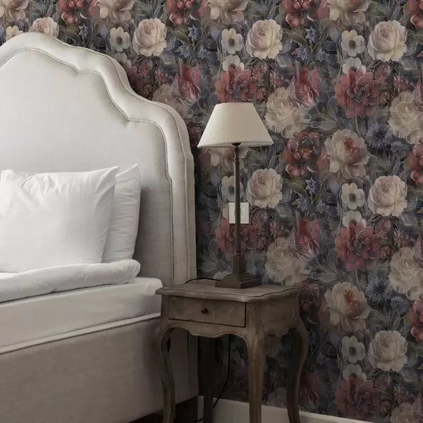 Tapete Malerischer Blumenstrauß aus großen Blumen auf tief indigoblauem Hintergrund Nr. a01021