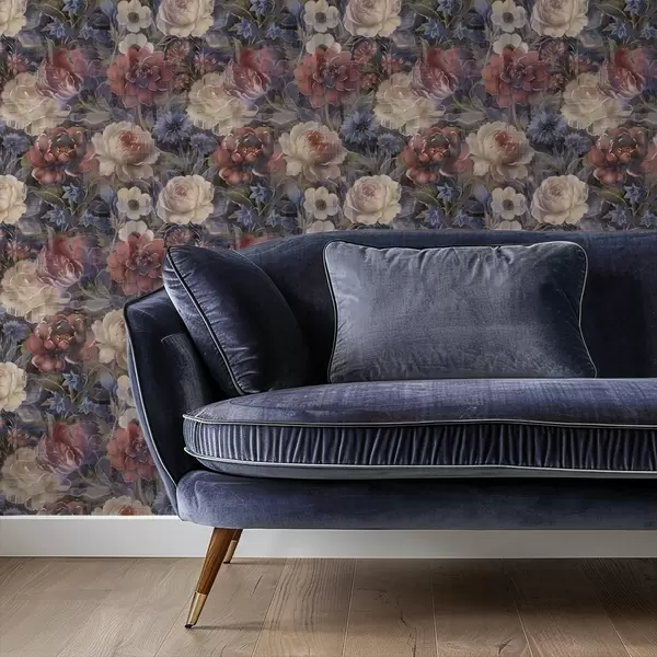 Tapete Malerischer Blumenstrauß aus großen Blumen auf tief indigoblauem Hintergrund Nr. a01021
