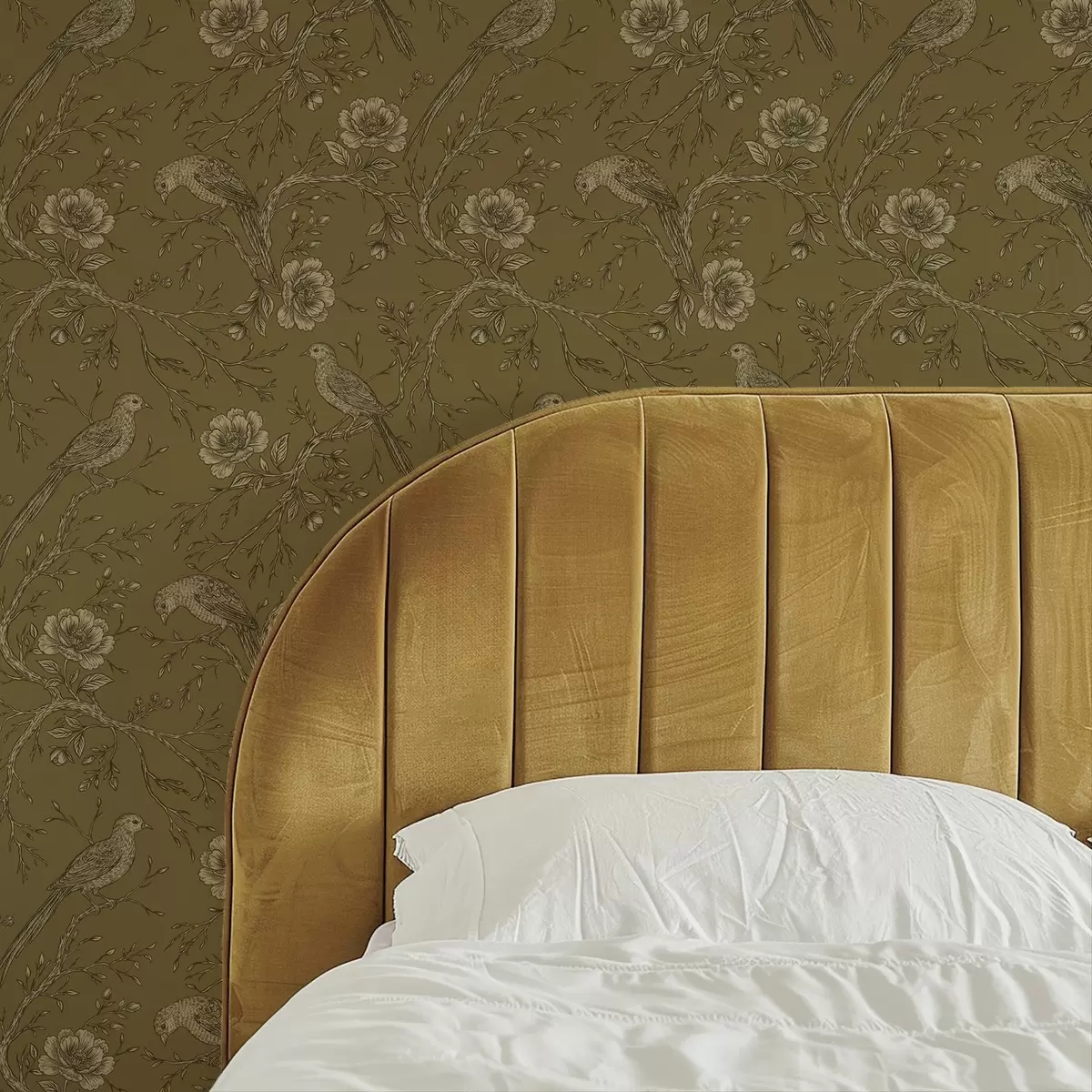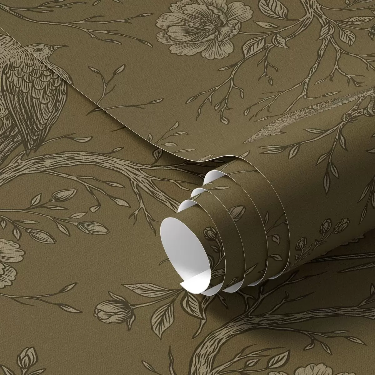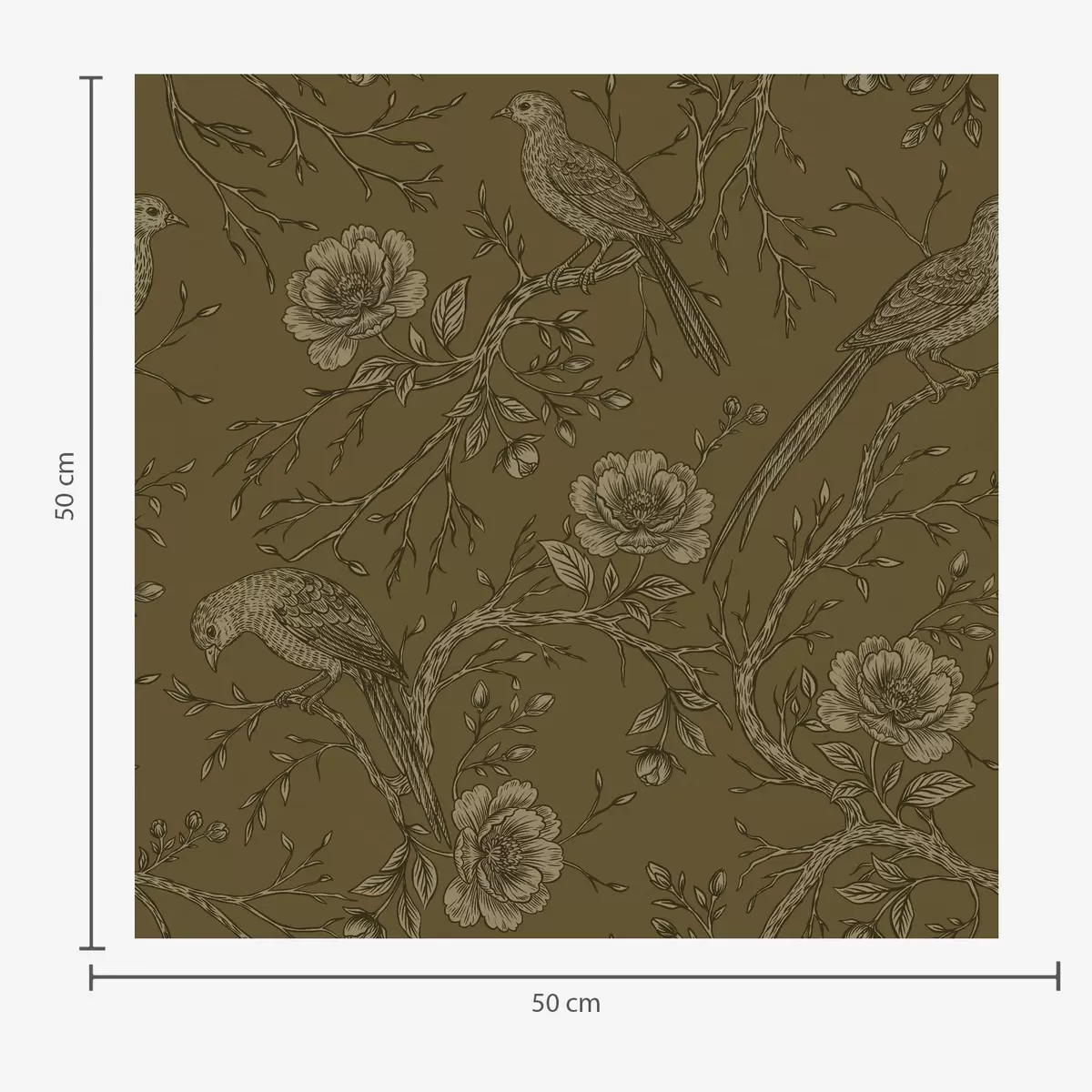 Tapete Vintage-Vögel und Blumen auf warmem olivfarbenem Hintergrund Nr. a01022v1