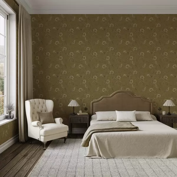 Tapete Vintage-Vögel und Blumen auf warmem olivfarbenem Hintergrund Nr. a01022v1
