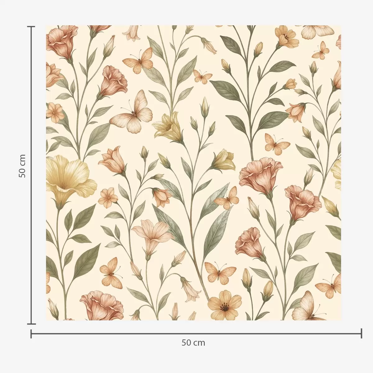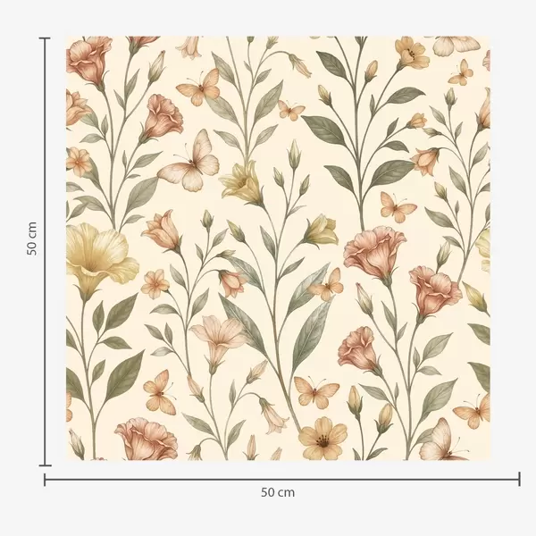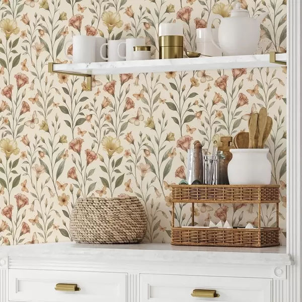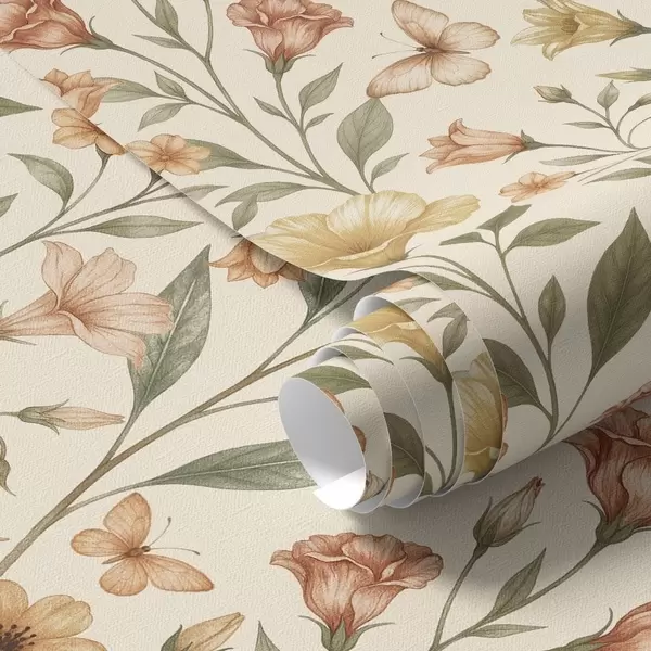 Tapete Zarte Pfirsichblüten und Schmetterlinge auf warmem Cremehintergrund Nr. a01026