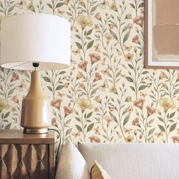 Tapete Zarte Pfirsichblüten und Schmetterlinge auf warmem Cremehintergrund Nr. a01026