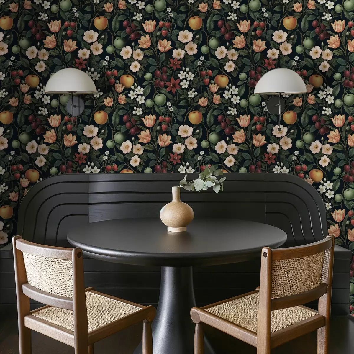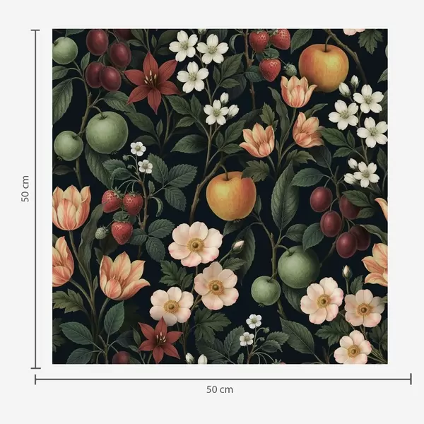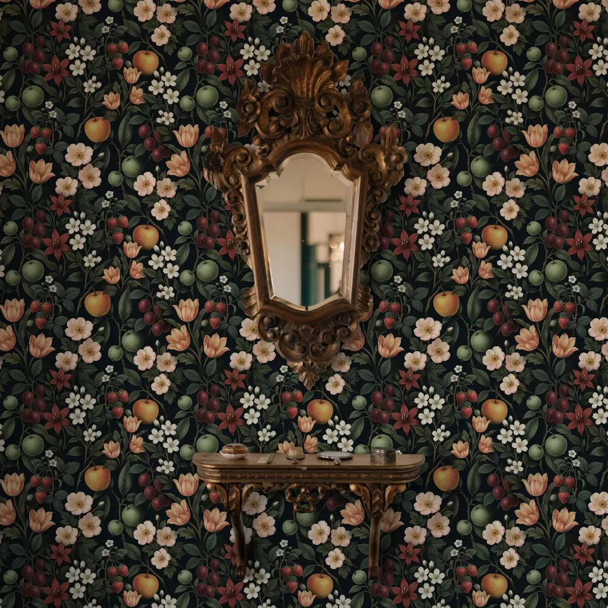 Tapete Dunkler Garten mit Blumen, reifen Äpfeln und Beeren Nr. a01034