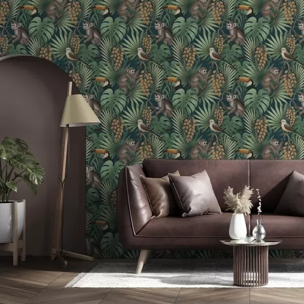 Tapete Affen und tropische Vögel im dichten Dschungelblattwerk Nr. a01037