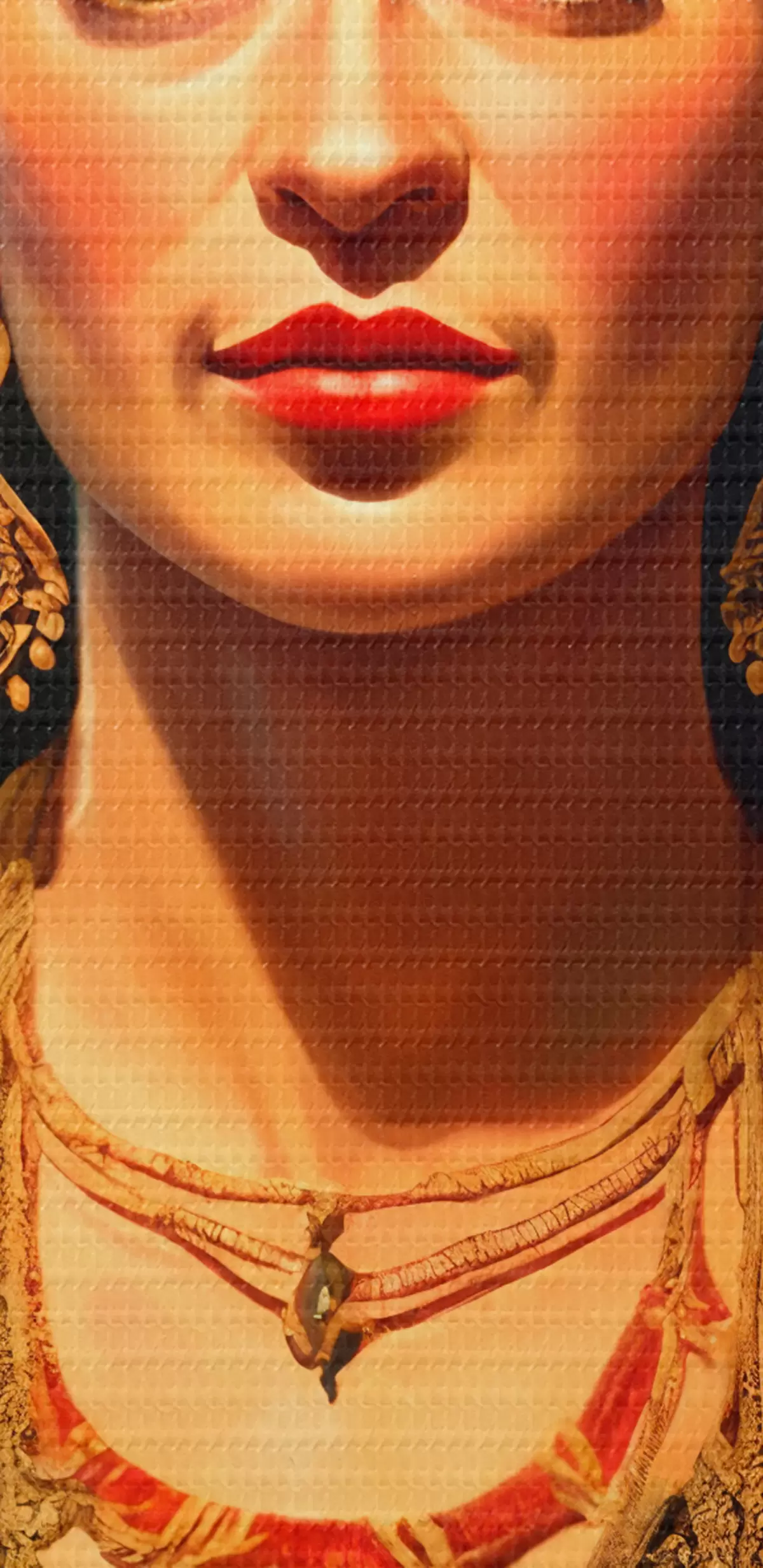Das Bild kann vorsichtig mit einem trockenen, weichen Tuch oder Schwamm abgewischt werden; es wird nicht empfohlen, feuchte Produkte zu verwenden. Die Verwendung eines feuchten Schwamms ist nur zulässig, wenn das Bild lackiert wurde.
