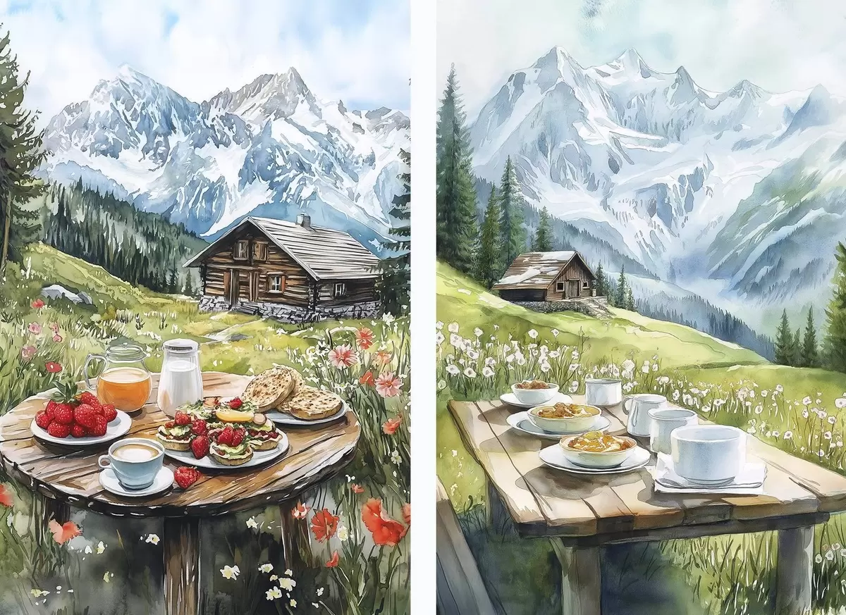 Wandbilder Die Alpen, schöne Berglandschaft, ästhetisches Frühstück, Holzhäuser m00403