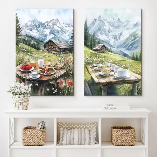 Wandbilder Die Alpen, schöne Berglandschaft, ästhetisches Frühstück, Holzhäuser Art. m00403