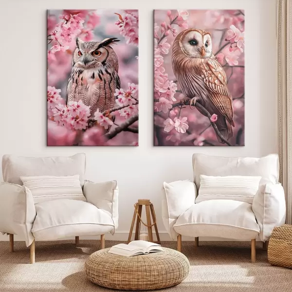 Wandbilder Eulen auf dem Kirschbaum, rosa Blumen, Realismus, Natur m00411