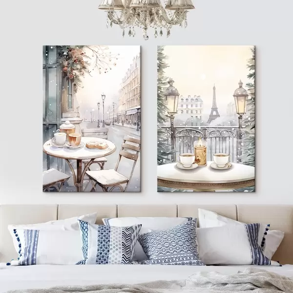 Wandbilder Ästhetische Cafés mit Tassen Kaffee, Paris Stadt Straße, Winter, Architektur Art. m00413