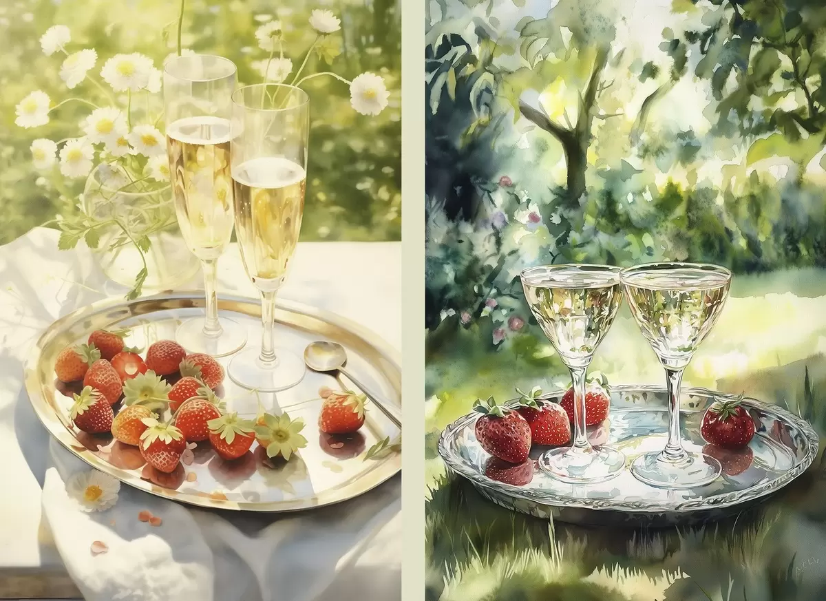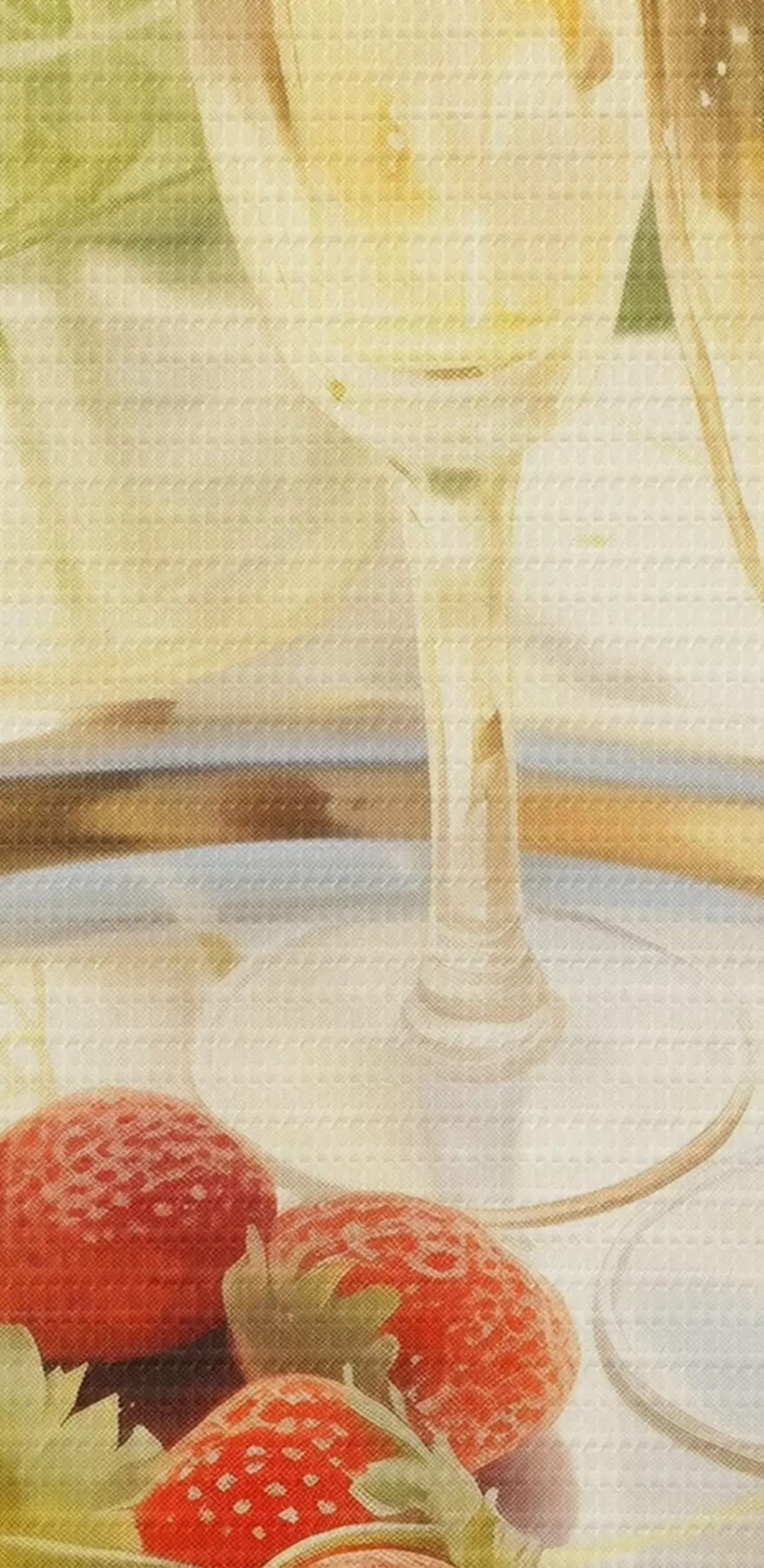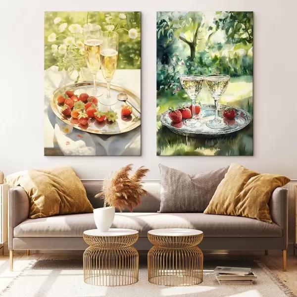 Wandbilder Sommerpicknick, Sektgläser mit Erdbeeren auf dem Tablett, Kamillenblüten Art. m00414