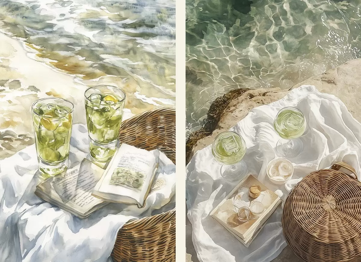 Wandbilder Cocktails am Strand, Aquarell-Stil Zeichnung, Meer, Sommer-Picknick Art. m00417