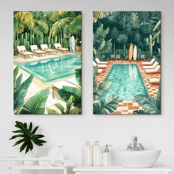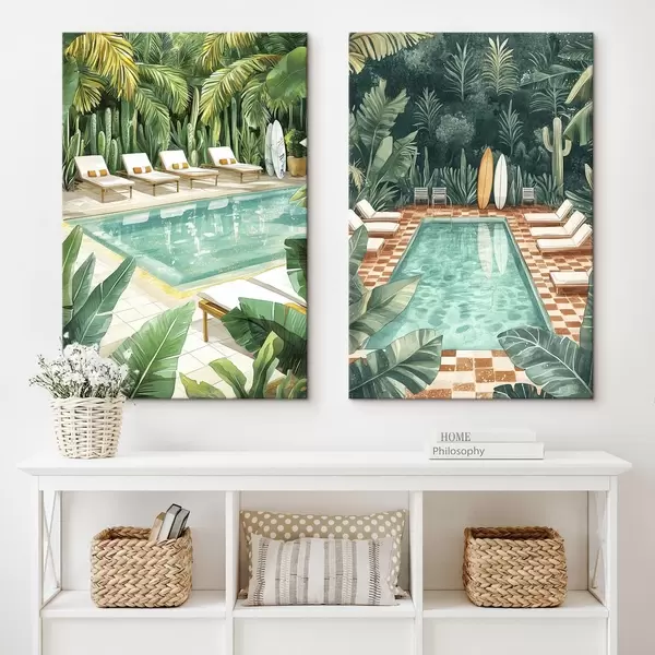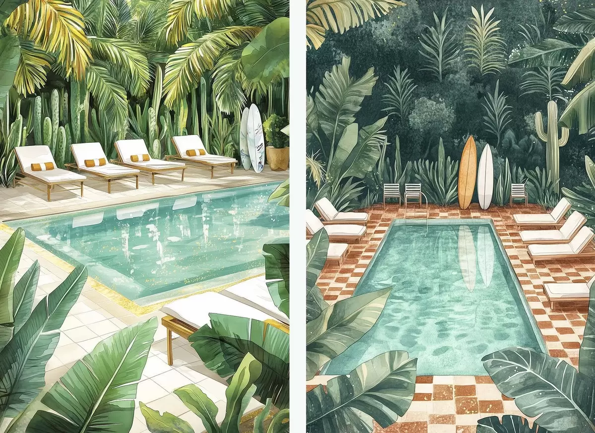 Wandbilder Sommerpool, Vintage, Tropenwald, Grünzeug, Palmen, Aquarellstil Art. m00422