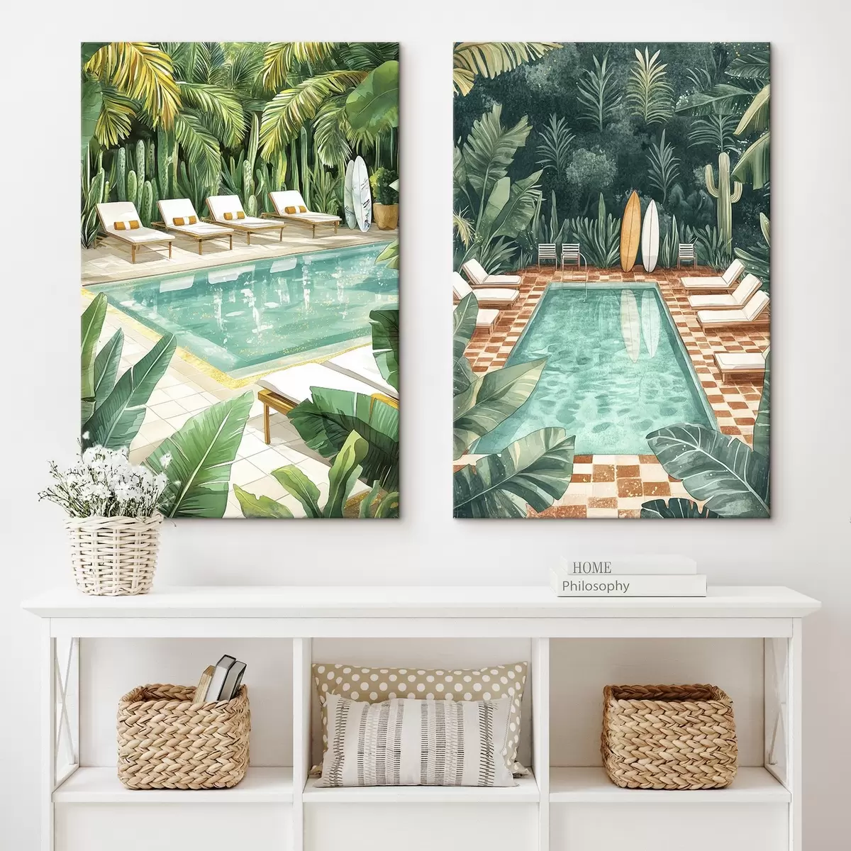 Wandbilder Sommerpool, Vintage, Tropenwald, Grünzeug, Palmen, Aquarellstil m00422