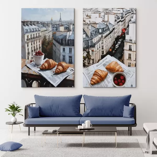 Wandbilder Stadtansicht auf einem Balkon in Paris, Eiffelturm, Erdbeeren, Kaffee, Tagebuch Art. m00445