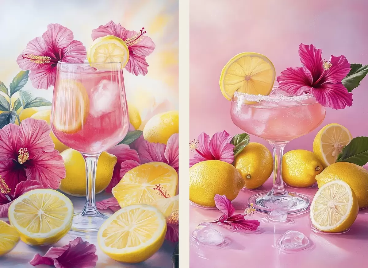 Wandbilder Cocktails mit Hibiskusblüten und Zitronen, Sommer, saftig, Aquarellstil Art. m00446