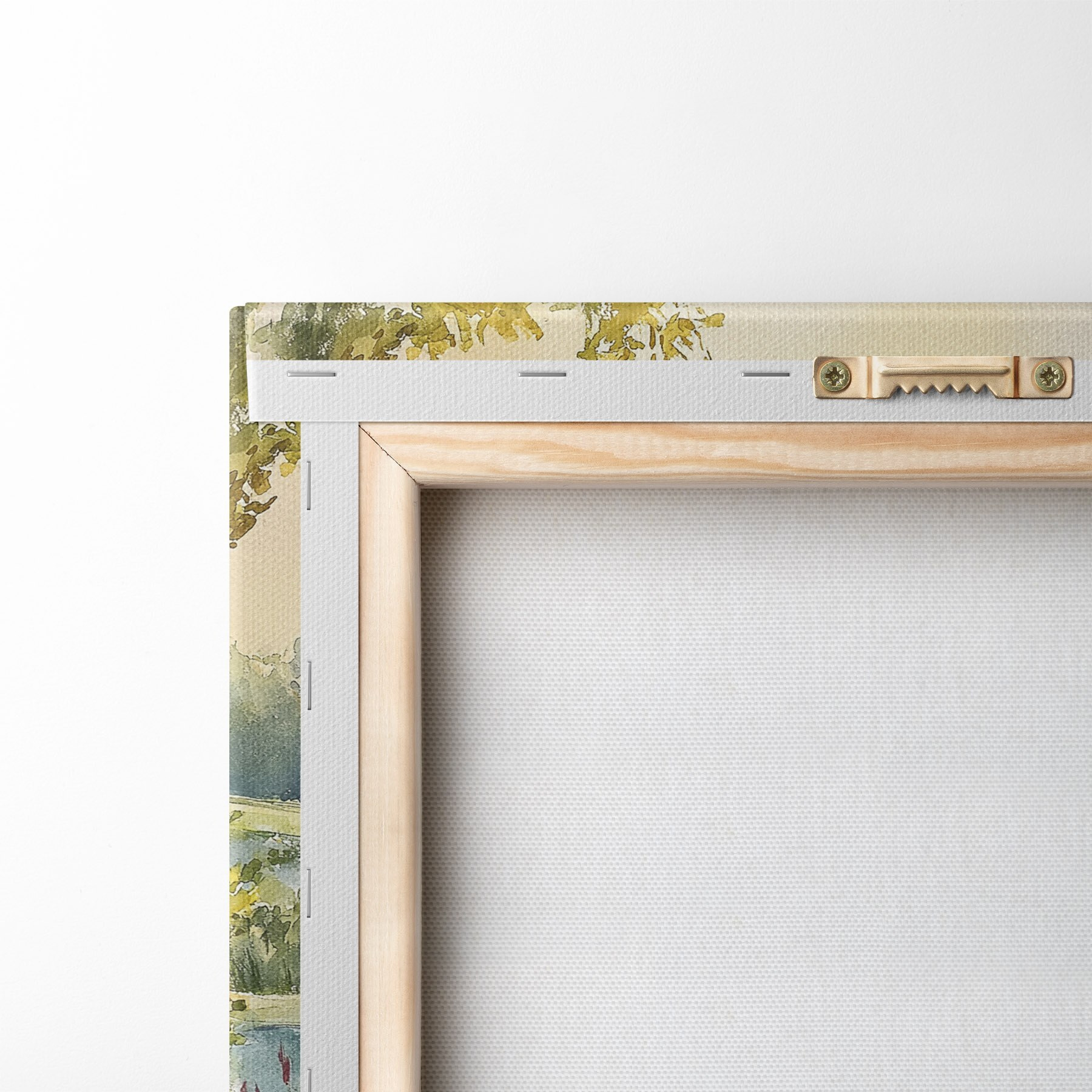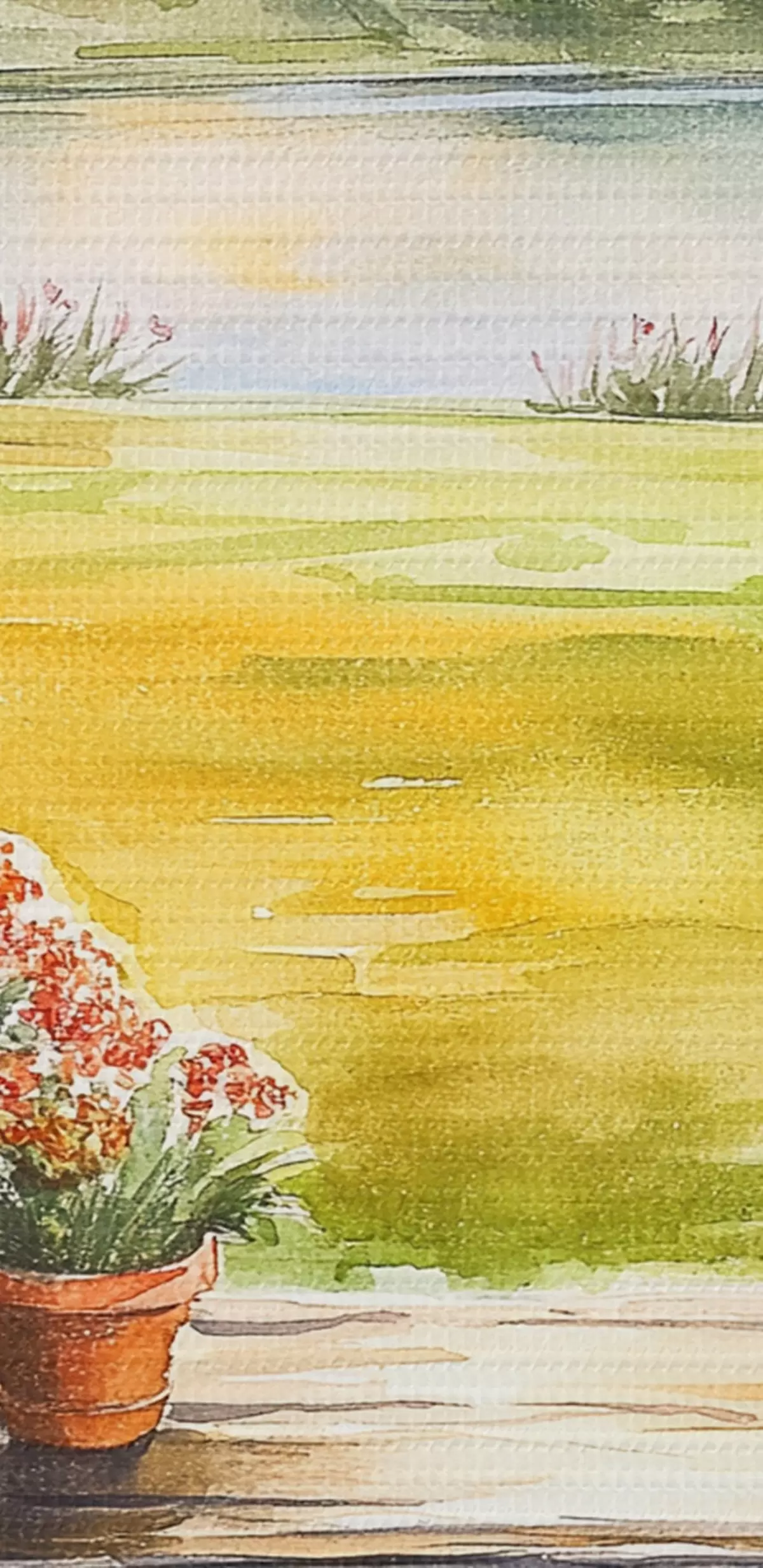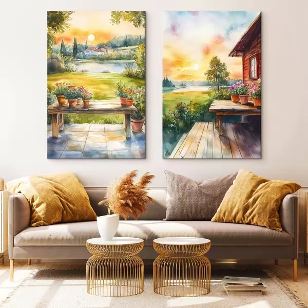 Wandbilder Sommerdorf, Sonnenuntergang, rustikal, Blumen, See, Aquarell-Stil Art. m00449