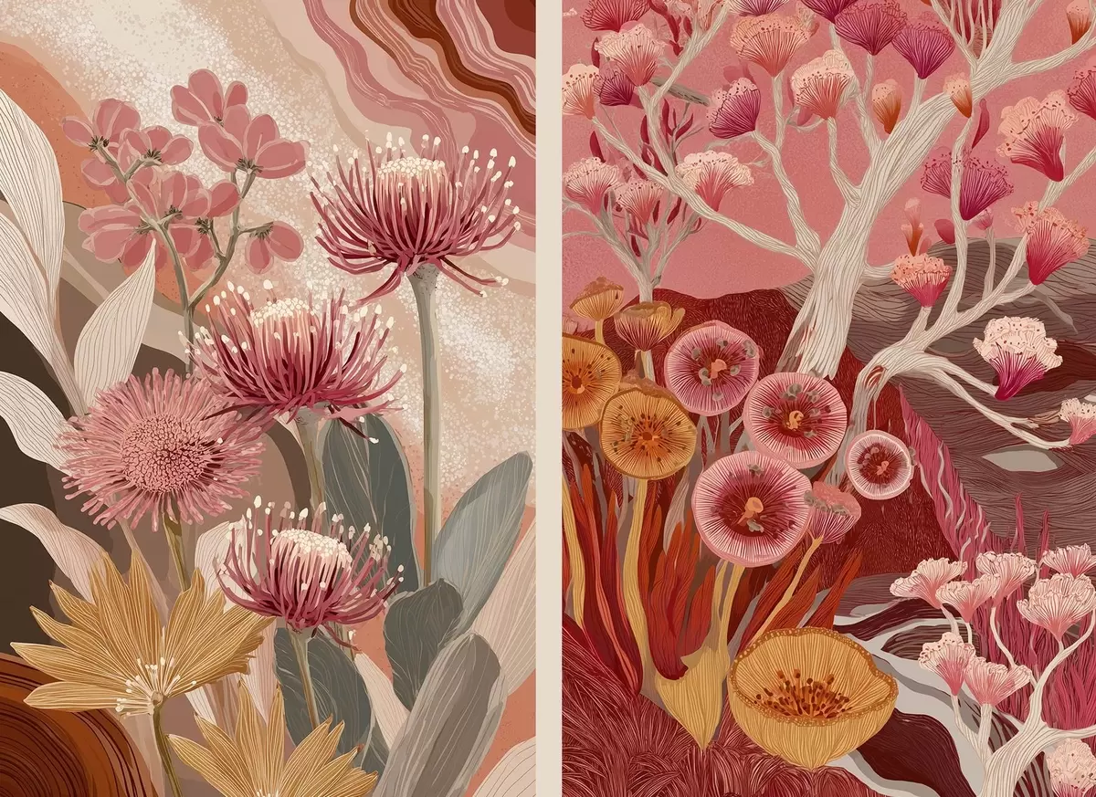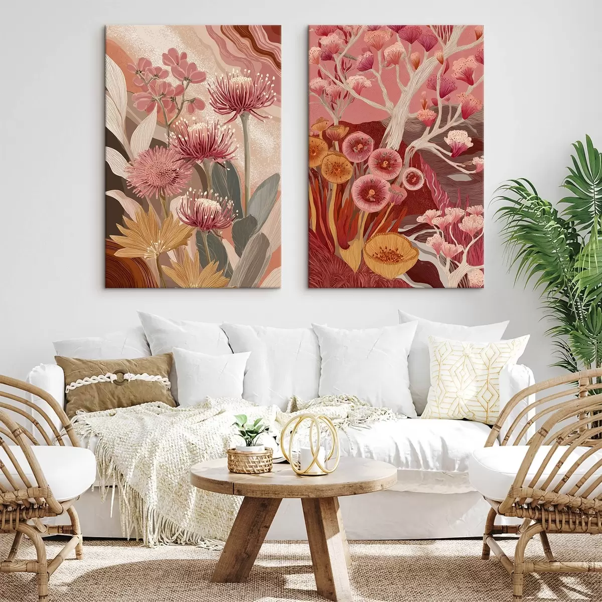 Wandbilder Blumen im Boho-Stil, detaillierte Zeichnung, burgunderrote Farben m00476