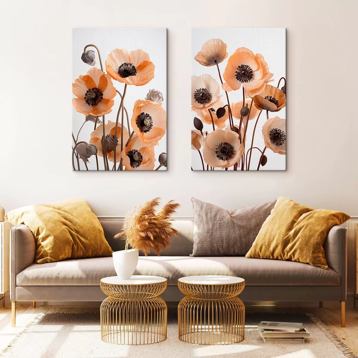 Wandbilder Orangefarbene Mohnblumen, getrocknete Blumen vor einem hellen Hintergrund, weiche Beleuchtung, zarte Blütenblätter, Blumenarrangement m00518