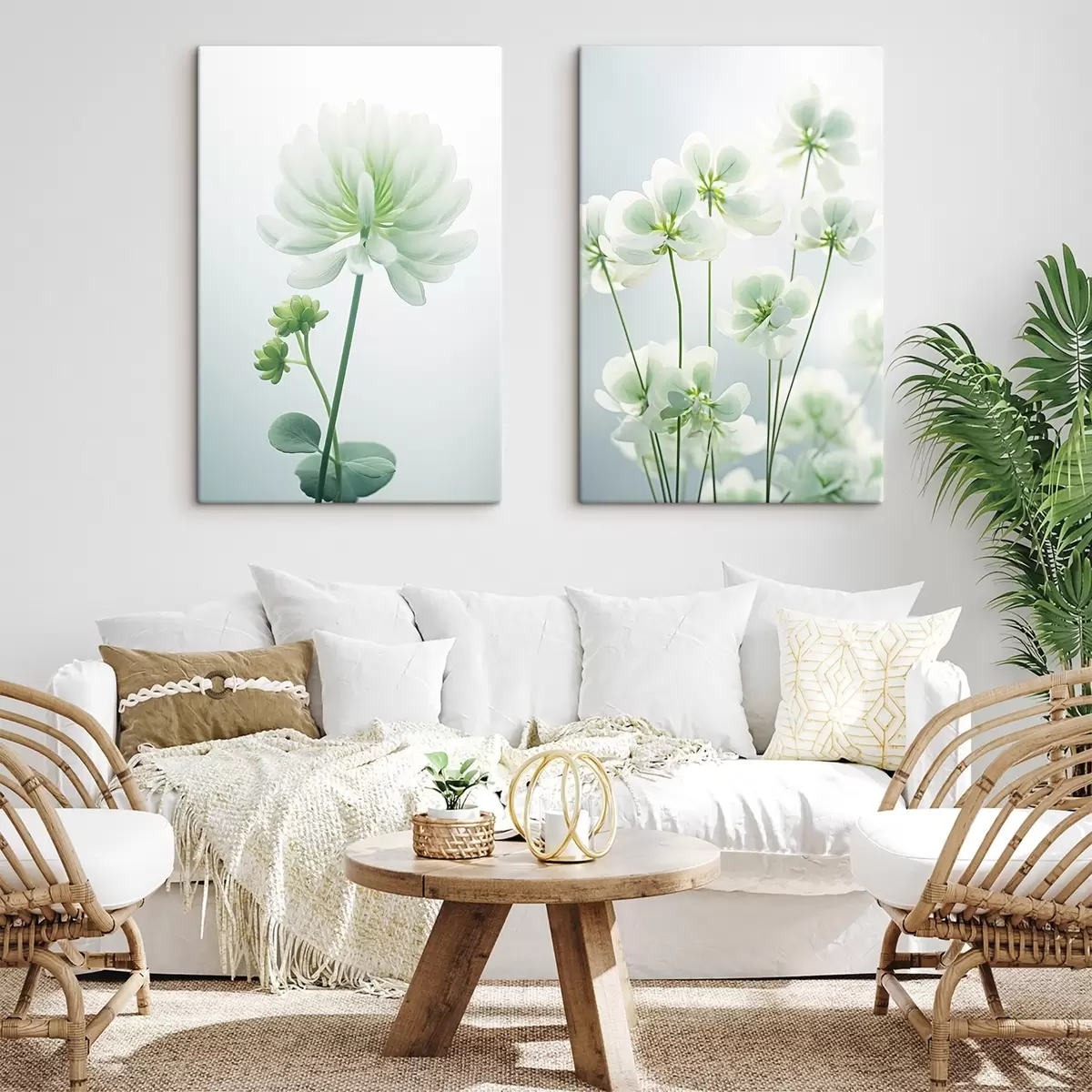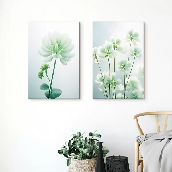 Wandbilder Weißer Klee Blumen mit grünen Stiel und Blätter, weiche Beleuchtung, sauberen Hintergrund, minimalistische Komposition, botanische Art. m00520