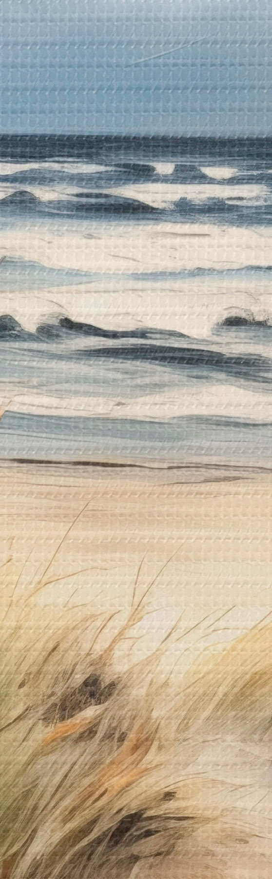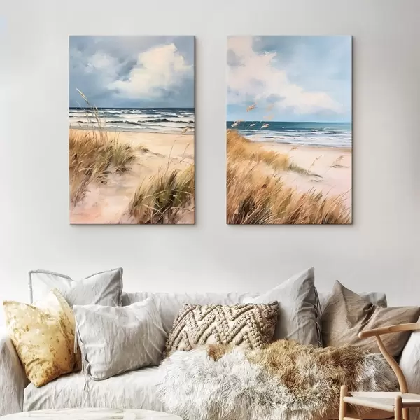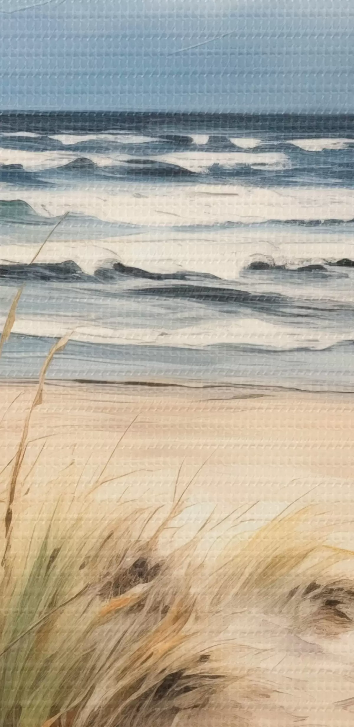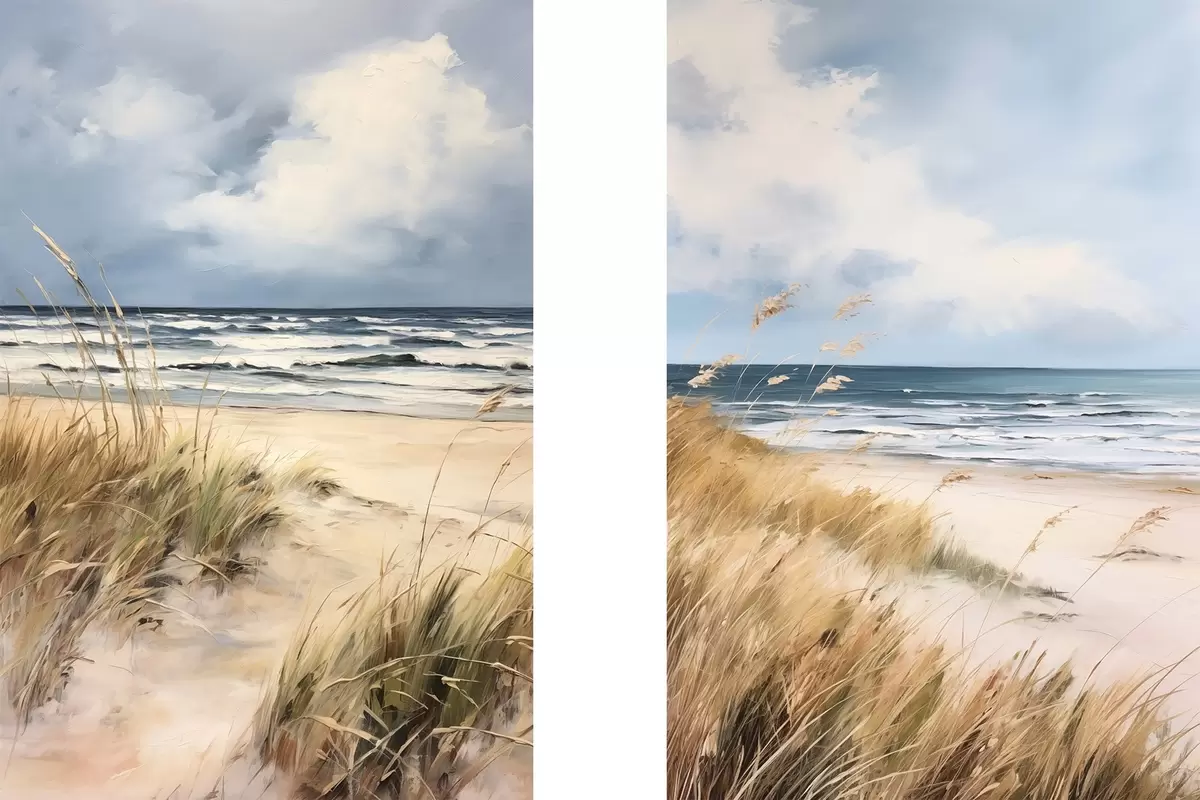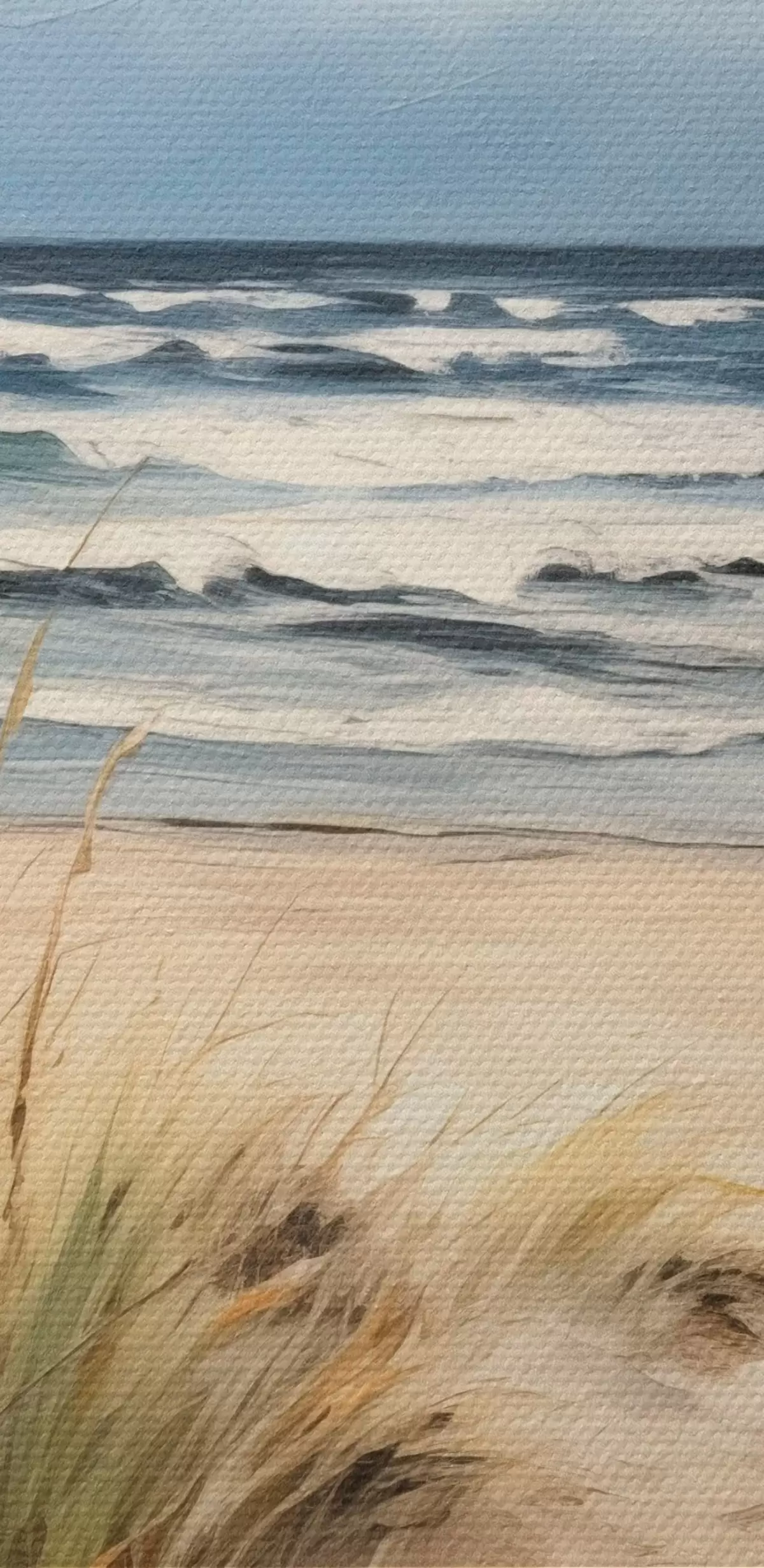 Wandbilder Ein Sandstrand mit hohem Gras im Vordergrund, das Meer mit Wellen und ein bewölkter Himmel im Hintergrund Art. m00521