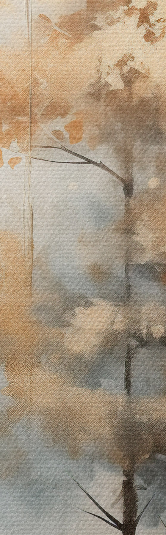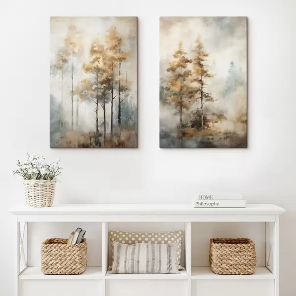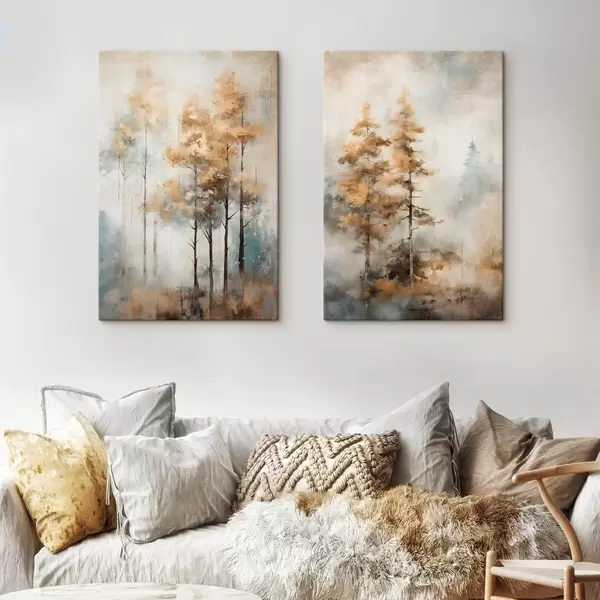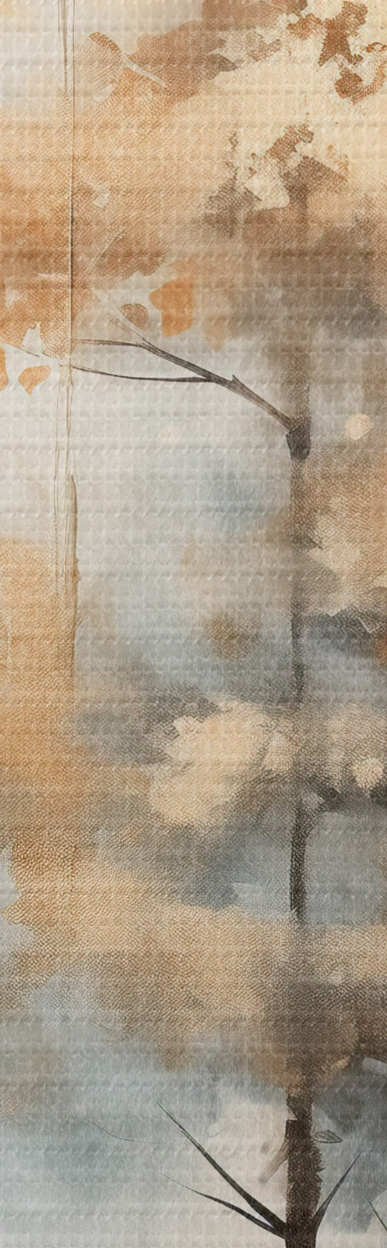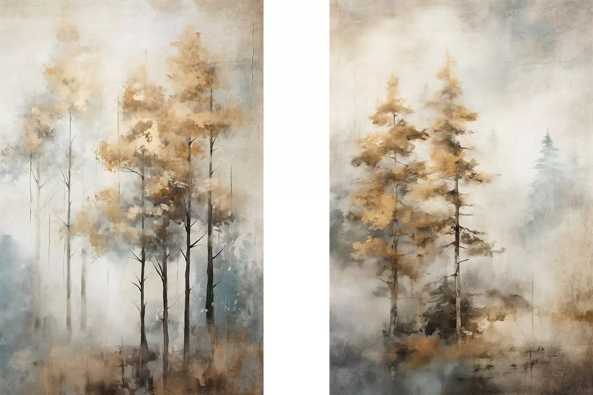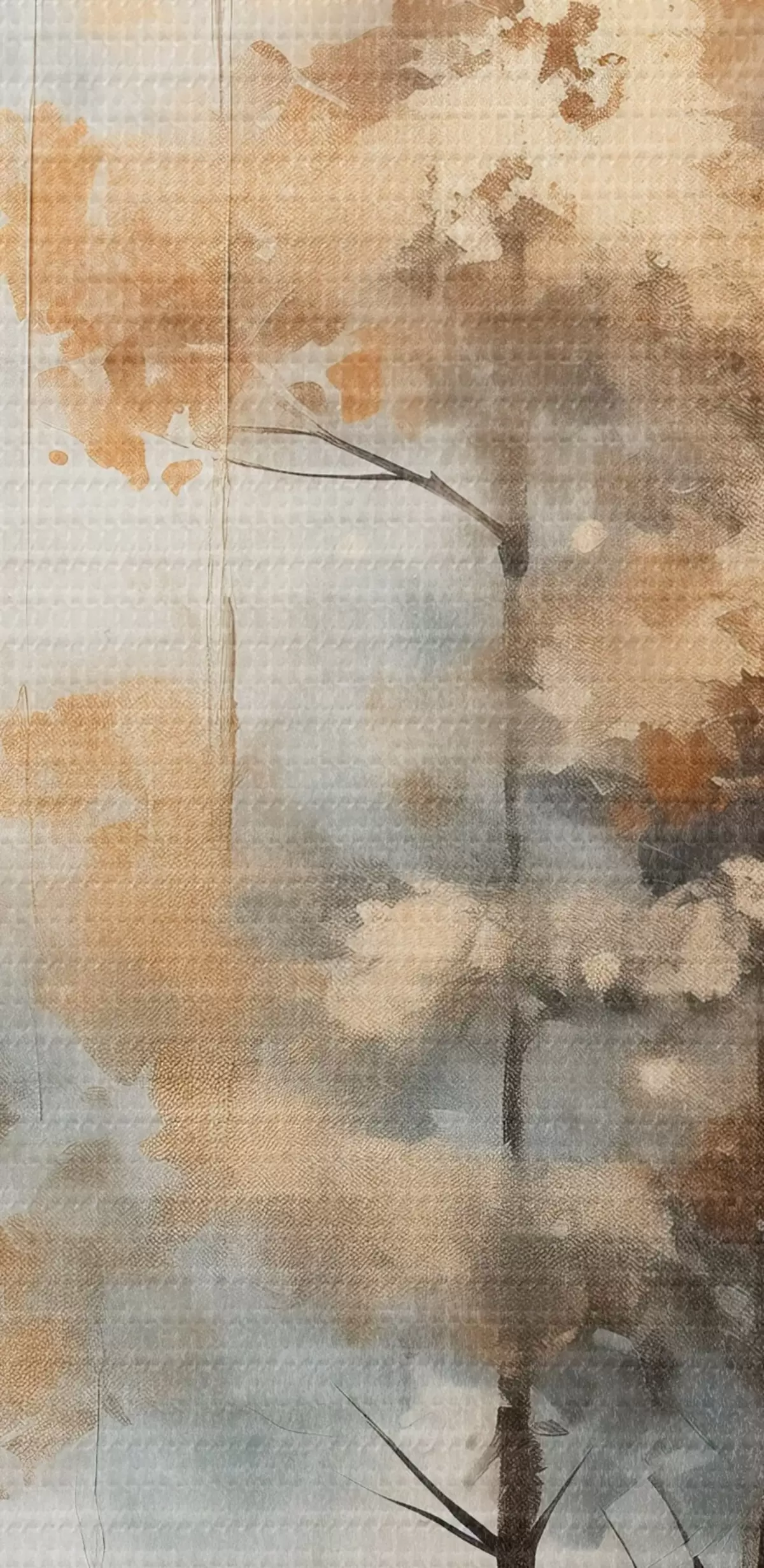 Wandbilder Texturierte hohe Bäume mit gelben Blättern in einem Wald, der Hintergrund ist eine Mischung aus weichen Blau- und Brauntönen m00528
