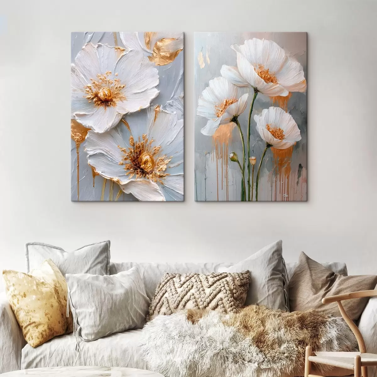 Wandbilder Volumetrische Malerei von weißen Blumen mit goldenen Akzenten auf grauem Hintergrund m00568