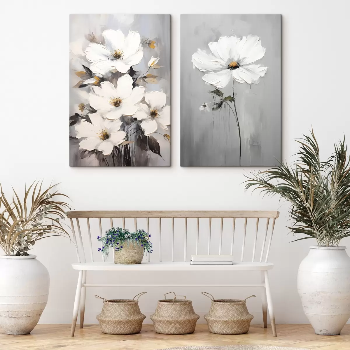 Wandbilder Künstlerische Komposition mit weißen Blumen und strukturierter Oberfläche im minimalistischen Stil Art. m00574