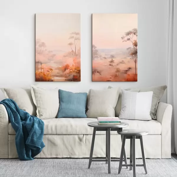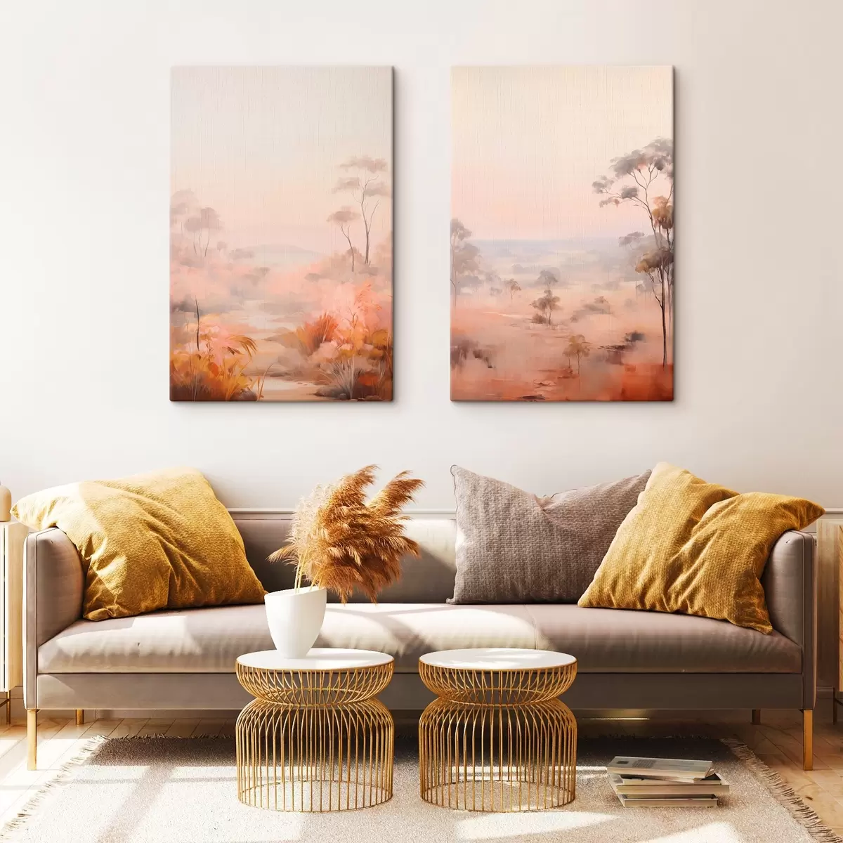 Wandbilder Eine Landschaft mit Sträuchern und Bäumen in Rosa-, Orange- und Brauntönen, mit Bergen im Hintergrund Art. m00646