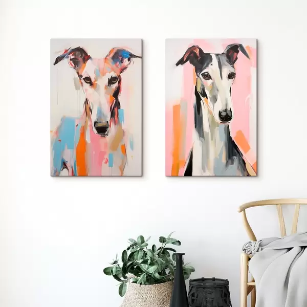 Wandbilder Ein Windhund, gemalt mit leuchtenden Farben wie Orange, Rosa und Blau, vor einem schlichten weißen Hintergrund Art. m00652