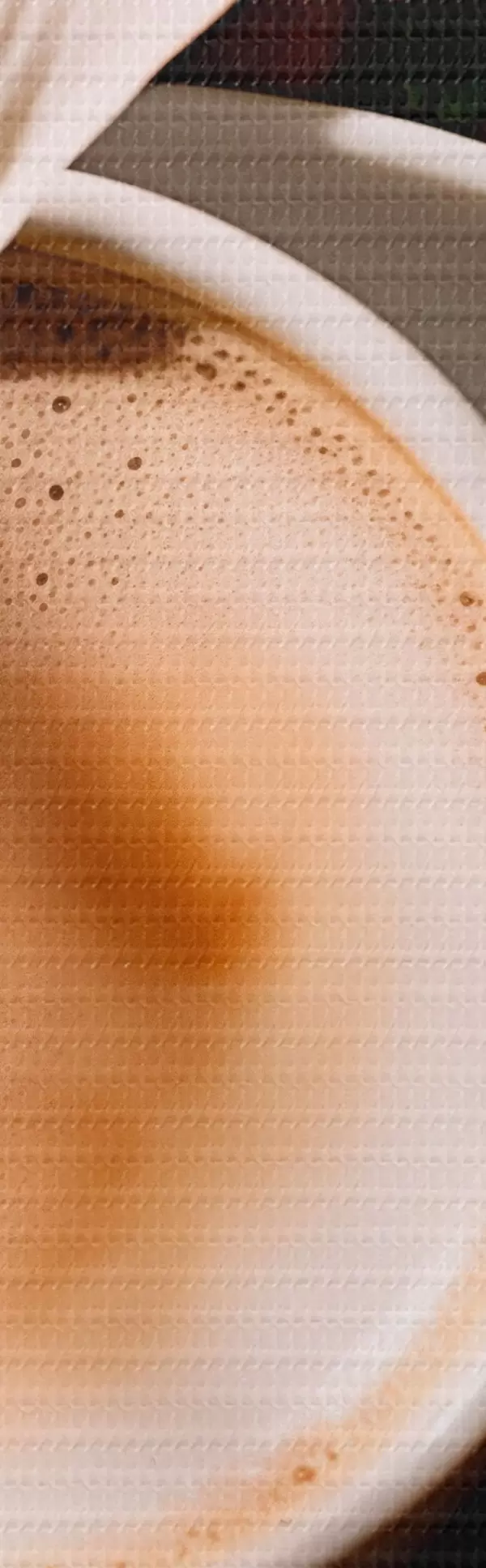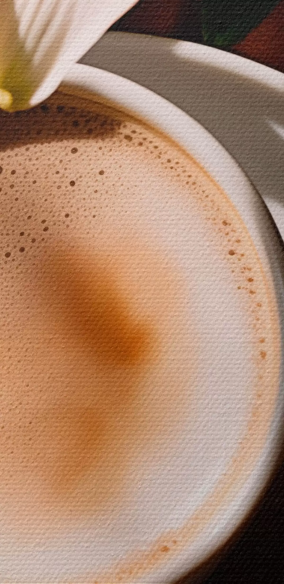 Wandbilder Eine Tasse Kaffee mit Schaum auf einem weißen Teller, einige Blumen im Hintergrund, mit Sonnenlicht Art. m00654
