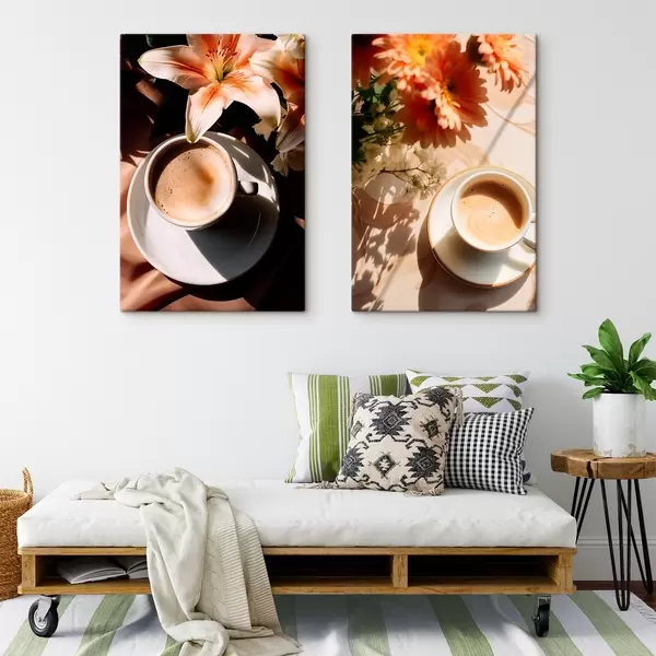 Wandbilder Eine Tasse Kaffee mit Schaum auf einem weißen Teller, einige Blumen im Hintergrund, mit Sonnenlicht Art. m00654