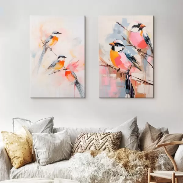 Wandbilder Vögel auf Zweigen, weiche Pastellfarben, heller Hintergrund mit rosa und weißen Farbtönen Art. m00658