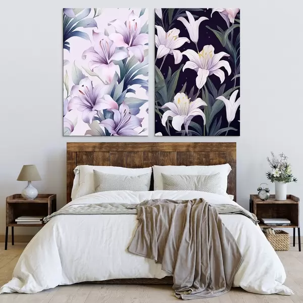Wandbilder Zarte rosa Lilien mit grünen Blättern auf hellem und dunklem Hintergrund Art. m00689