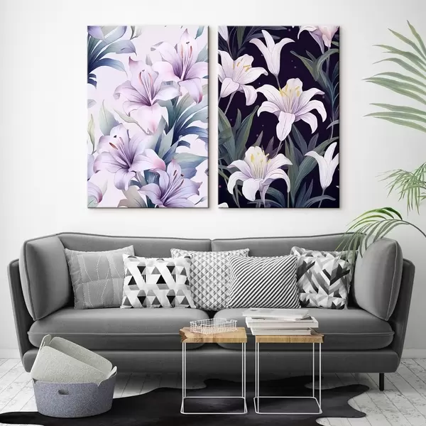 Wandbilder Zarte rosa Lilien mit grünen Blättern auf hellem und dunklem Hintergrund Art. m00689