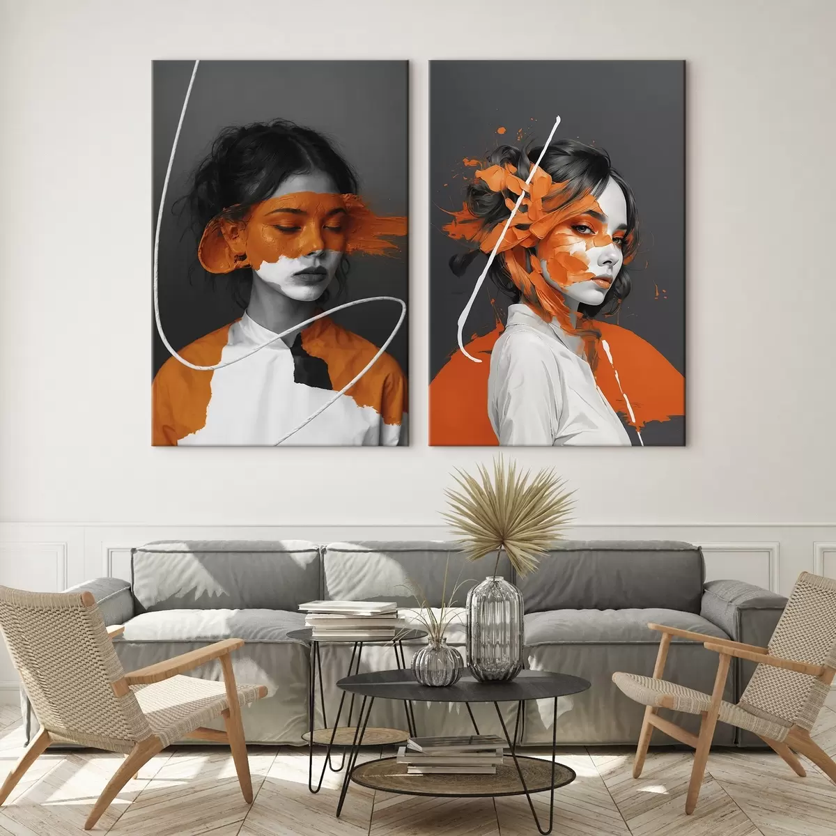 Wandbilder Porträts von Mädchen mit abstrakten orangefarbenen Pinselstrichen m00693