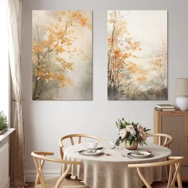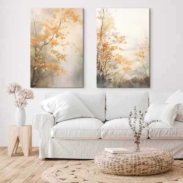Wandbilder Herbstbäume mit orangefarbenen Blättern und Zweigen, sanfter Aquarellstil, zarte Pinselstriche Art. m00826