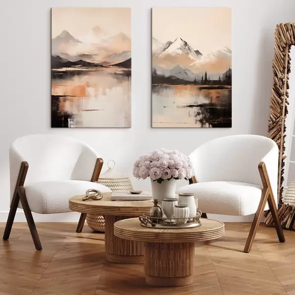 Wandbilder Eine Landschaftsmalerei mit Struktur, die Berge und einen See imitiert Art. m00831