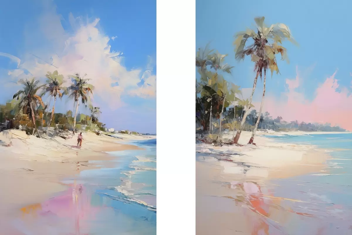 Wandbilder Abstrakte Landschaft, ein Strand mit Palmen, strahlender Sonnenschein mit blauem Himmel und einigen Wolken Art. m00885