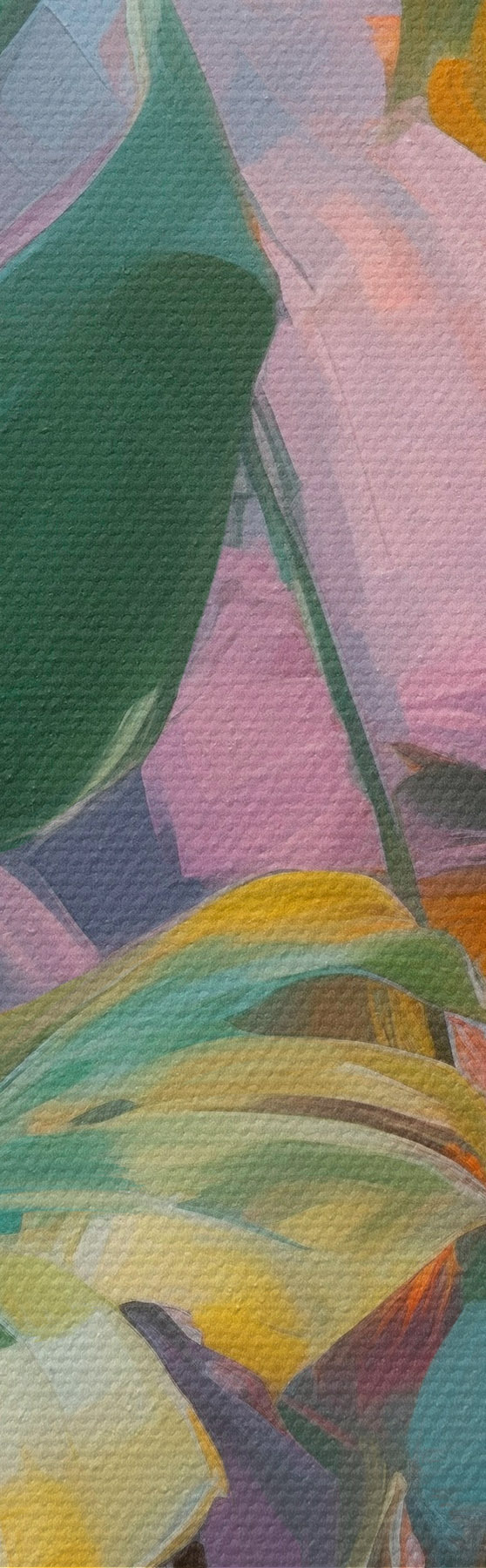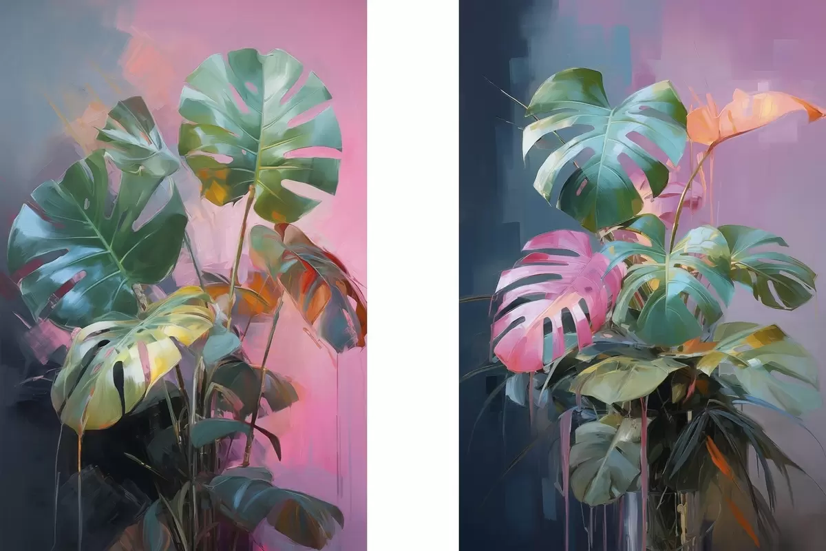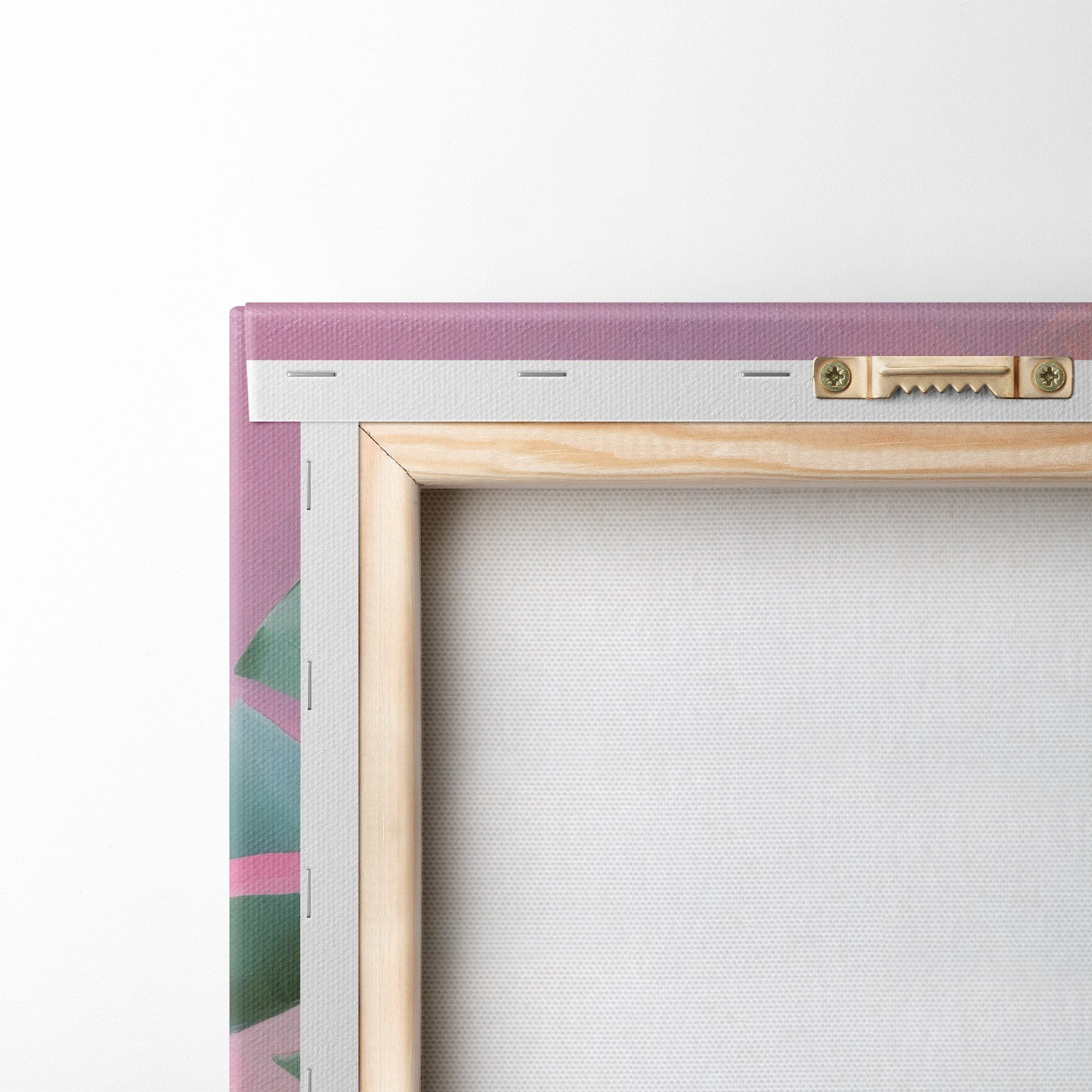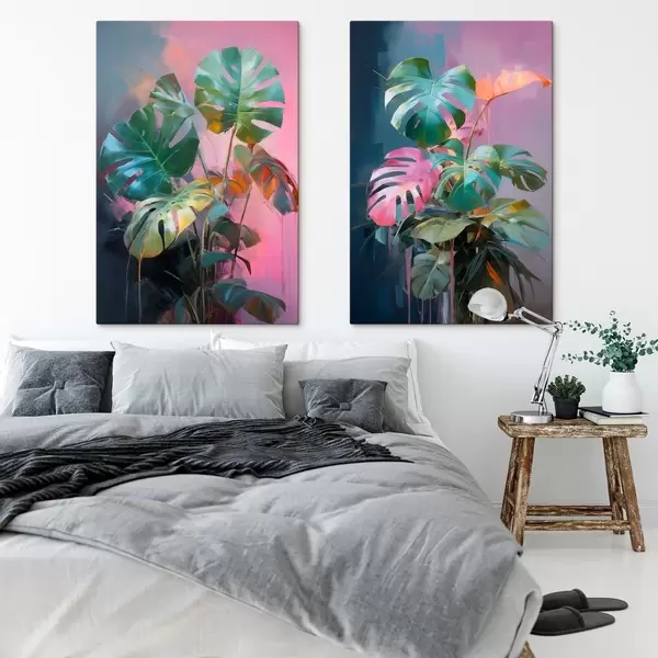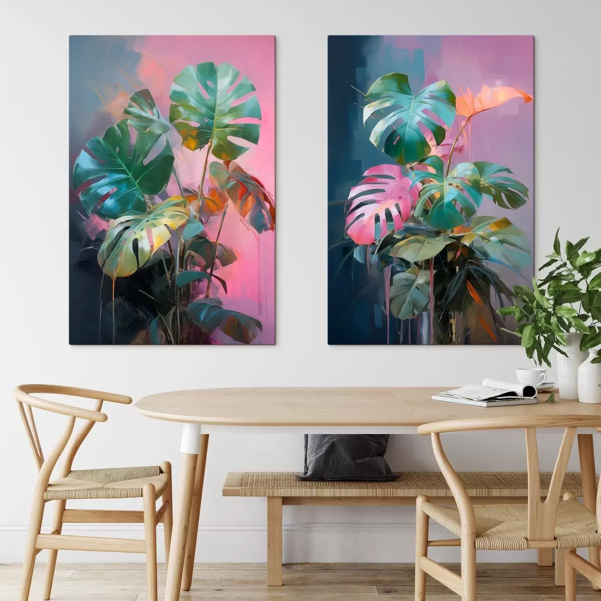 Wandbilder Abstrakte Monstera-Pflanze mit leuchtend grünen Blättern vor einem Hintergrund aus zarten Rosa- und Violetttönen Art. m00886