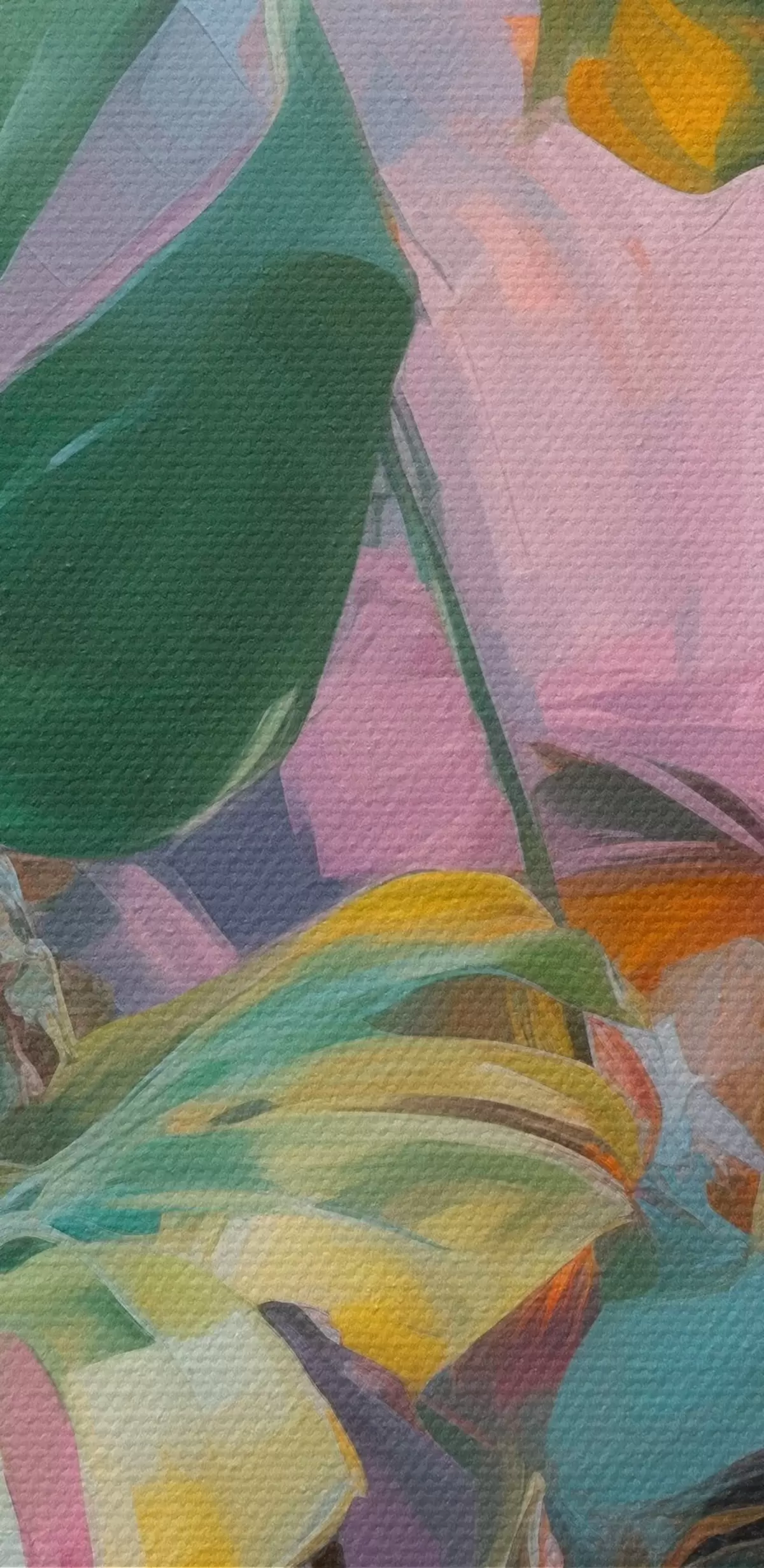 Wandbilder Abstrakte Monstera-Pflanze mit leuchtend grünen Blättern vor einem Hintergrund aus zarten Rosa- und Violetttönen m00886