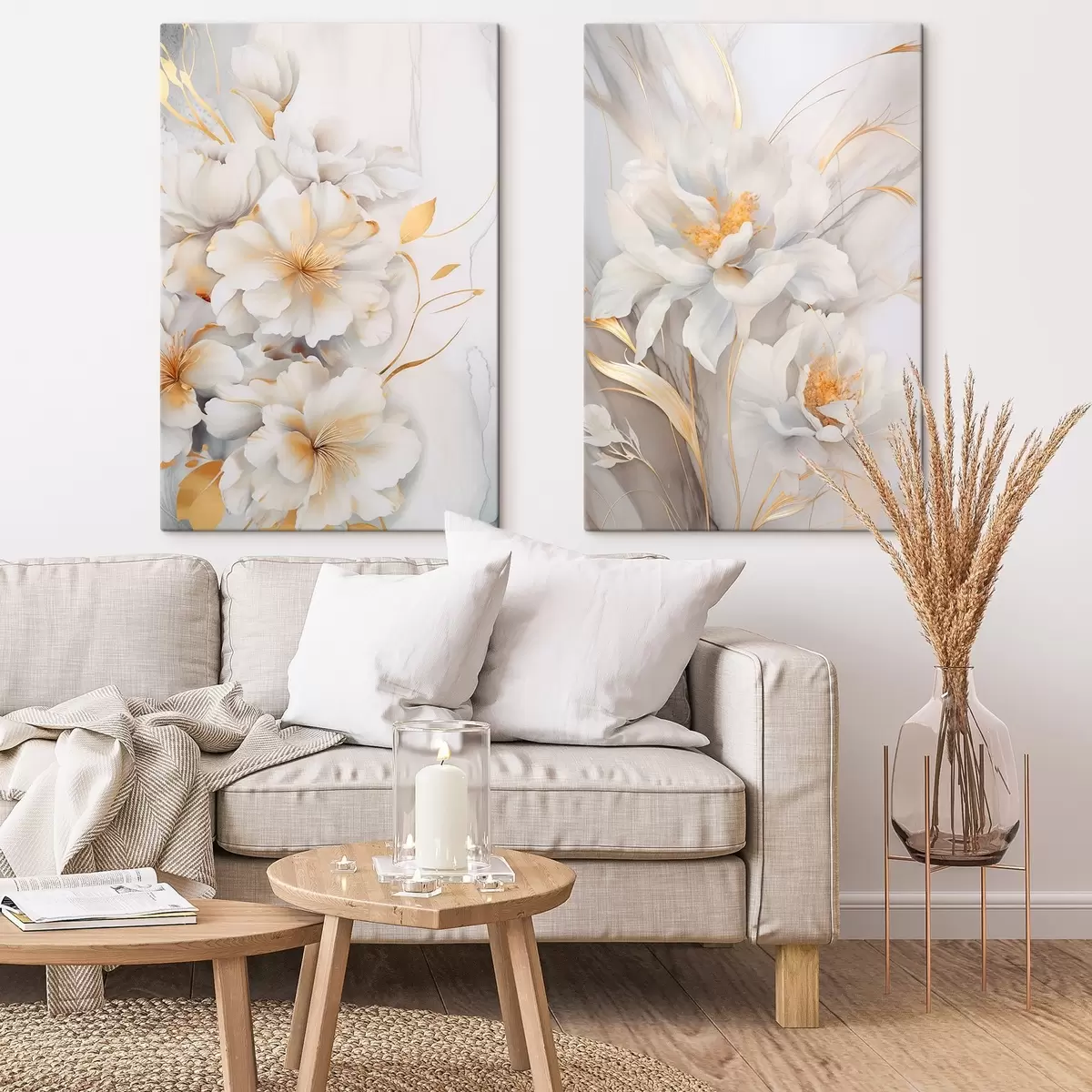 Wandbilder Weiße Blüten mit gelben Details, Blütenblätter mit dezenten Schatten, heller Hintergrund mit dezentem Marmoreffekt m00889