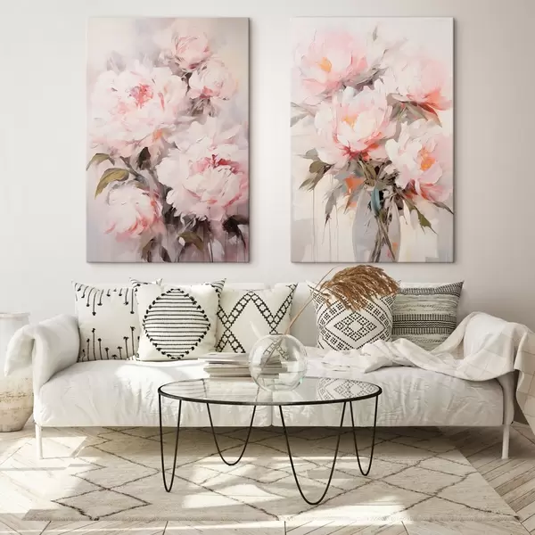 Wandbilder Ein Strauß hellrosa Pfingstrosen mit grünen Blättern, sanfte Pinselstriche, Pastellfarben, auf hellem Hintergrund Art. m00890