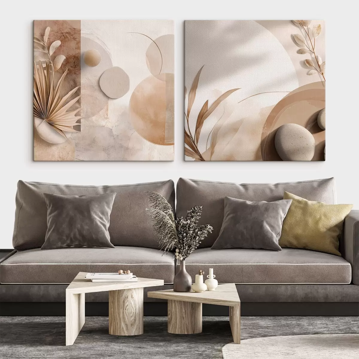 Wandbilder Zwei Leinwände mit getrockneten Blättern und strukturierten Formen m00893