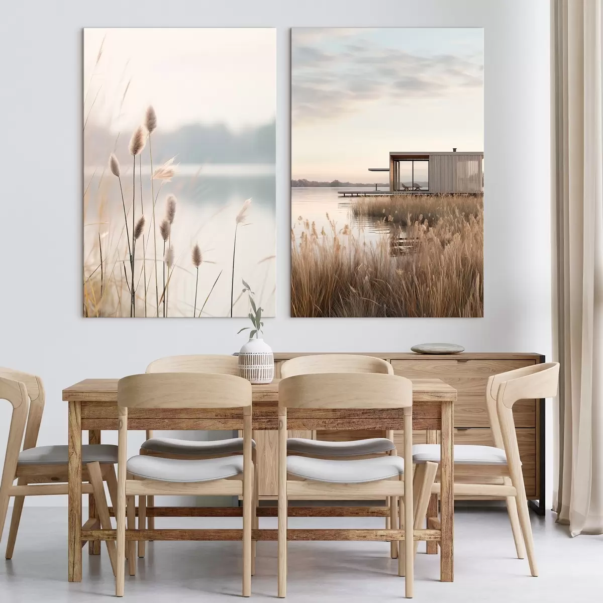Wandbilder Weiche Schilfpflanzen an einem ruhigen See und eine moderne Hütte am Ufer m00970