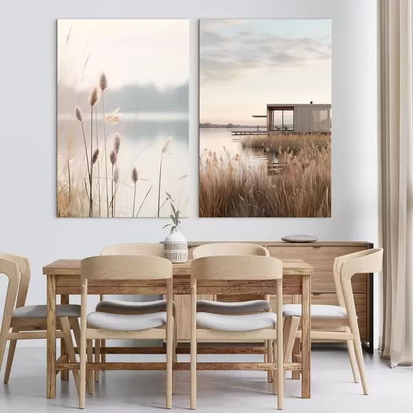 Wandbilder Weiche Schilfpflanzen an einem ruhigen See und eine moderne Hütte am Ufer Art. m00970