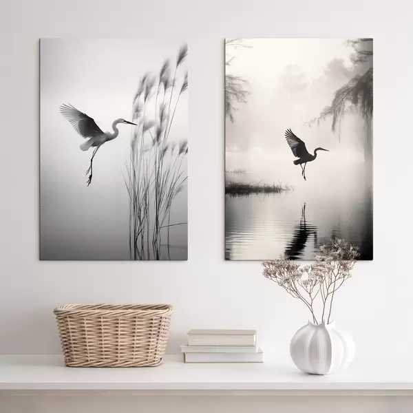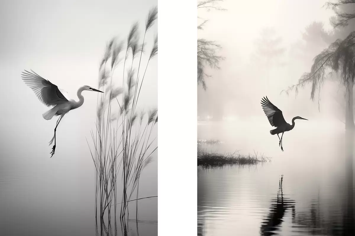 Wandbilder Ein weißer Reiher mit ausgebreiteten Flügeln, der in der Nähe von hohen Schilfpflanzen fliegt, minimalistische Komposition in Schwarz und Weiß m01007