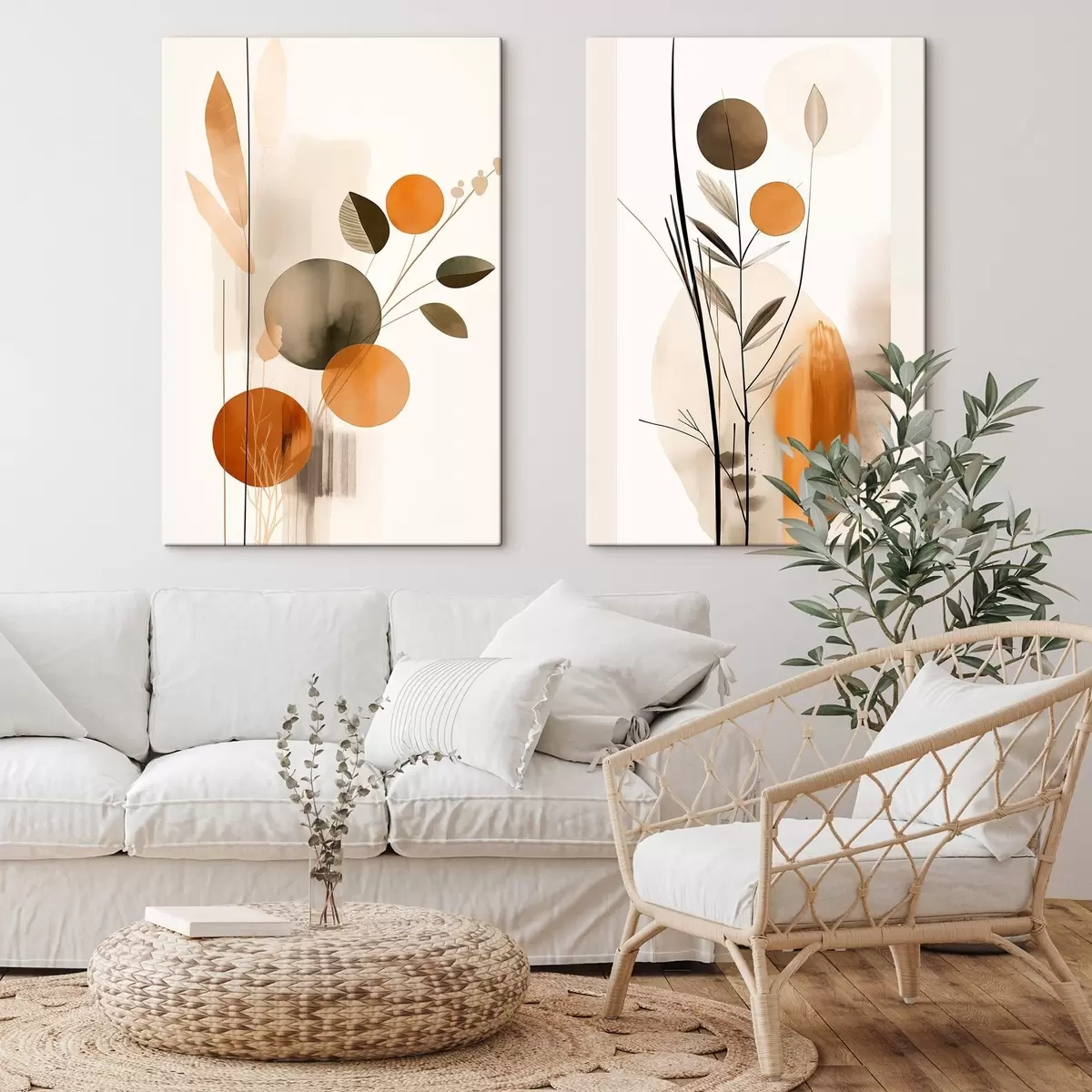 Wandbilder Abstrakte Malerei-Imitation mit orangefarbenen und grauen Kreisen, Blättern und Zweigen, moderner Stil, Aquarelleffekt m01009